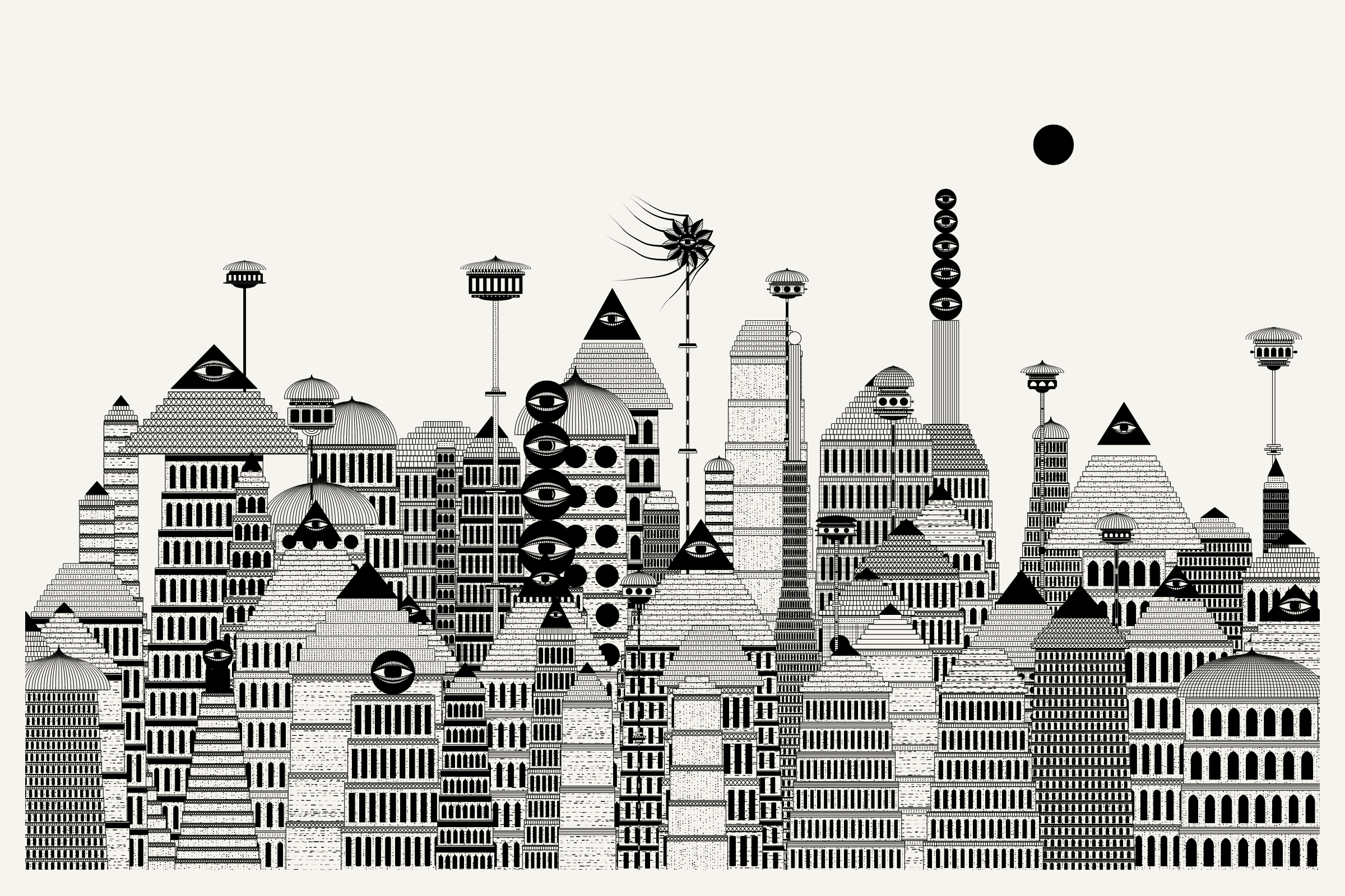 _Alan Ki Aankhen_ is an exploration of other-worldly cityscapes in the visual aesthetic of Fahad’s distinct style with pen and paper. The title, translated as _Alan’s Eyes_, alludes to Alan Turing’s machine intelligence test - a thought experiment foreshadowing a moment in which we can no longer differentiate between the real and the artificial. Though first proposed in 1950, the topic feels especially relevant today, as even our creative practices are being carried by shifting technological tides.