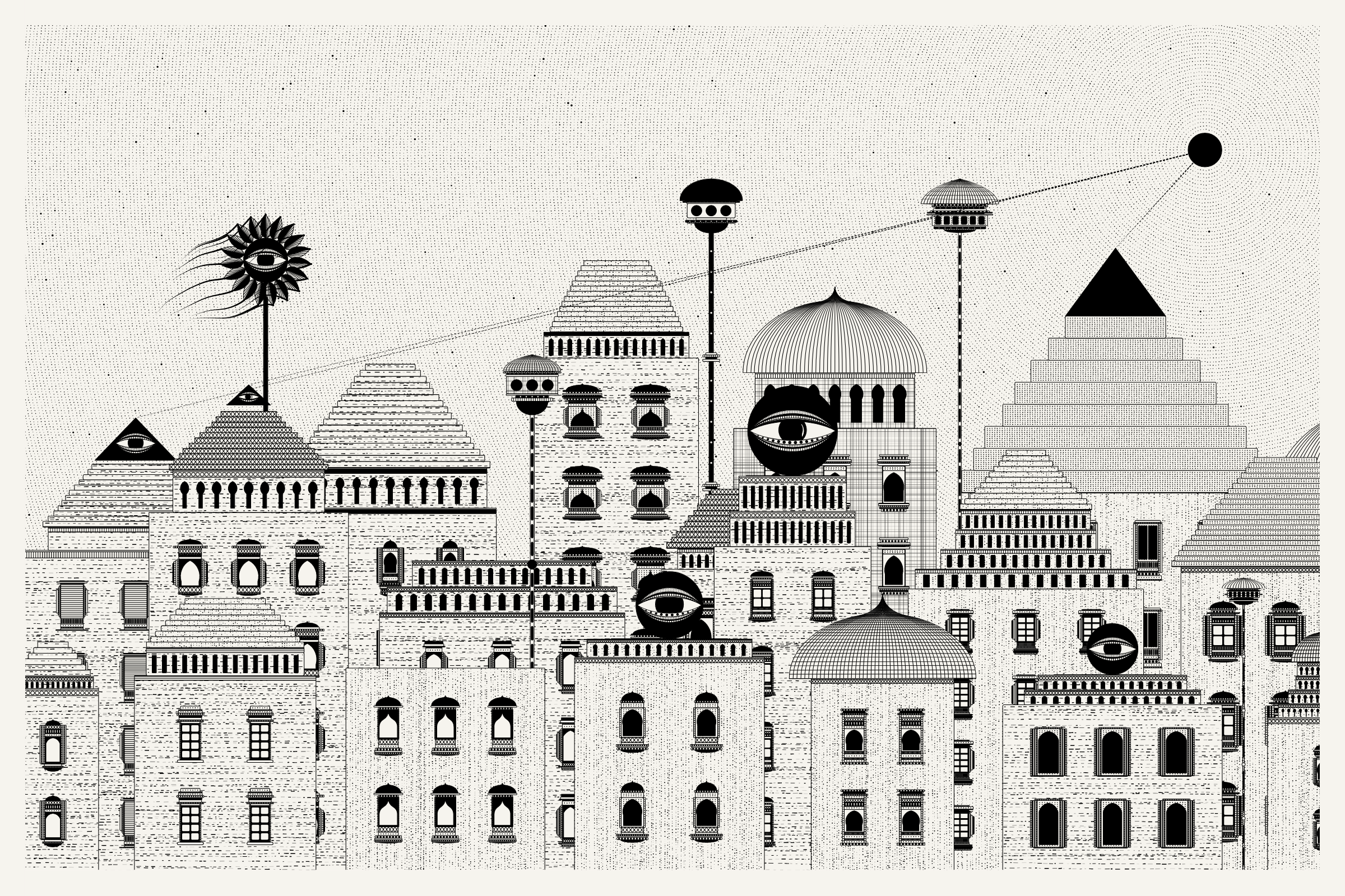 _Alan Ki Aankhen_ is an exploration of other-worldly cityscapes in the visual aesthetic of Fahad’s distinct style with pen and paper. The title, translated as _Alan’s Eyes_, alludes to Alan Turing’s machine intelligence test - a thought experiment foreshadowing a moment in which we can no longer differentiate between the real and the artificial. Though first proposed in 1950, the topic feels especially relevant today, as even our creative practices are being carried by shifting technological tides.