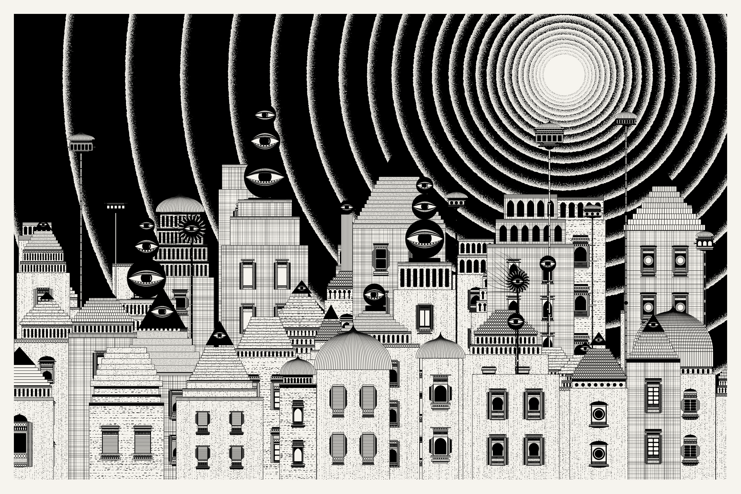 _Alan Ki Aankhen_ is an exploration of other-worldly cityscapes in the visual aesthetic of Fahad’s distinct style with pen and paper. The title, translated as _Alan’s Eyes_, alludes to Alan Turing’s machine intelligence test - a thought experiment foreshadowing a moment in which we can no longer differentiate between the real and the artificial. Though first proposed in 1950, the topic feels especially relevant today, as even our creative practices are being carried by shifting technological tides.