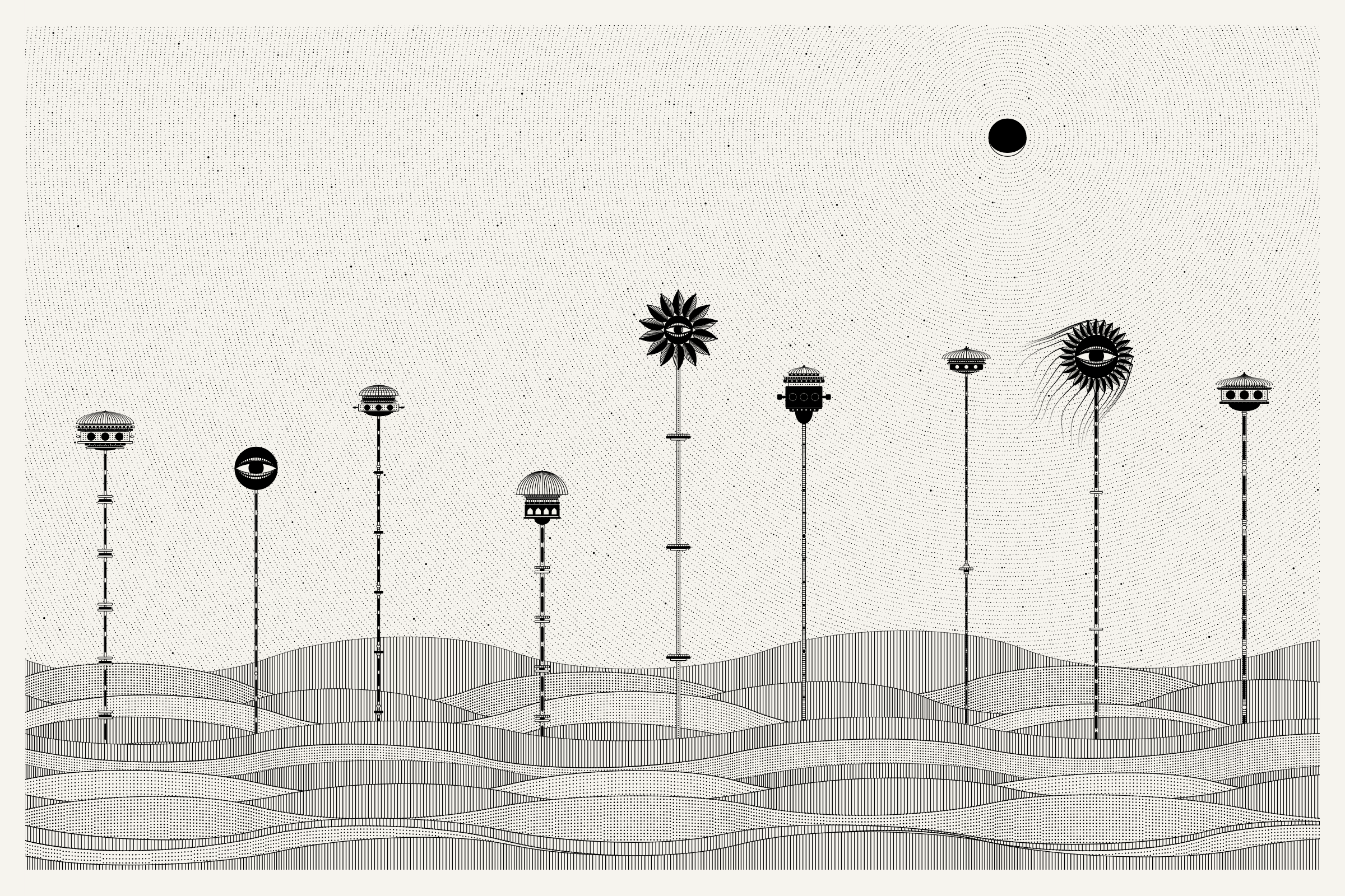 The algorithms and decision-making encoded into this generative art project intentionally imitate Fahad’s approach on traditional mediums - composition rules, textures, and overall themes. The visual elements are inspired by Fahad’s memories from his nomadic life. You’ll find intricate windows from Rajasthan, massive Egyptian pyramids rising from the horizon, a density of civilization only seen in New York, and the moon - a comforting and shared sight no matter where you stand.