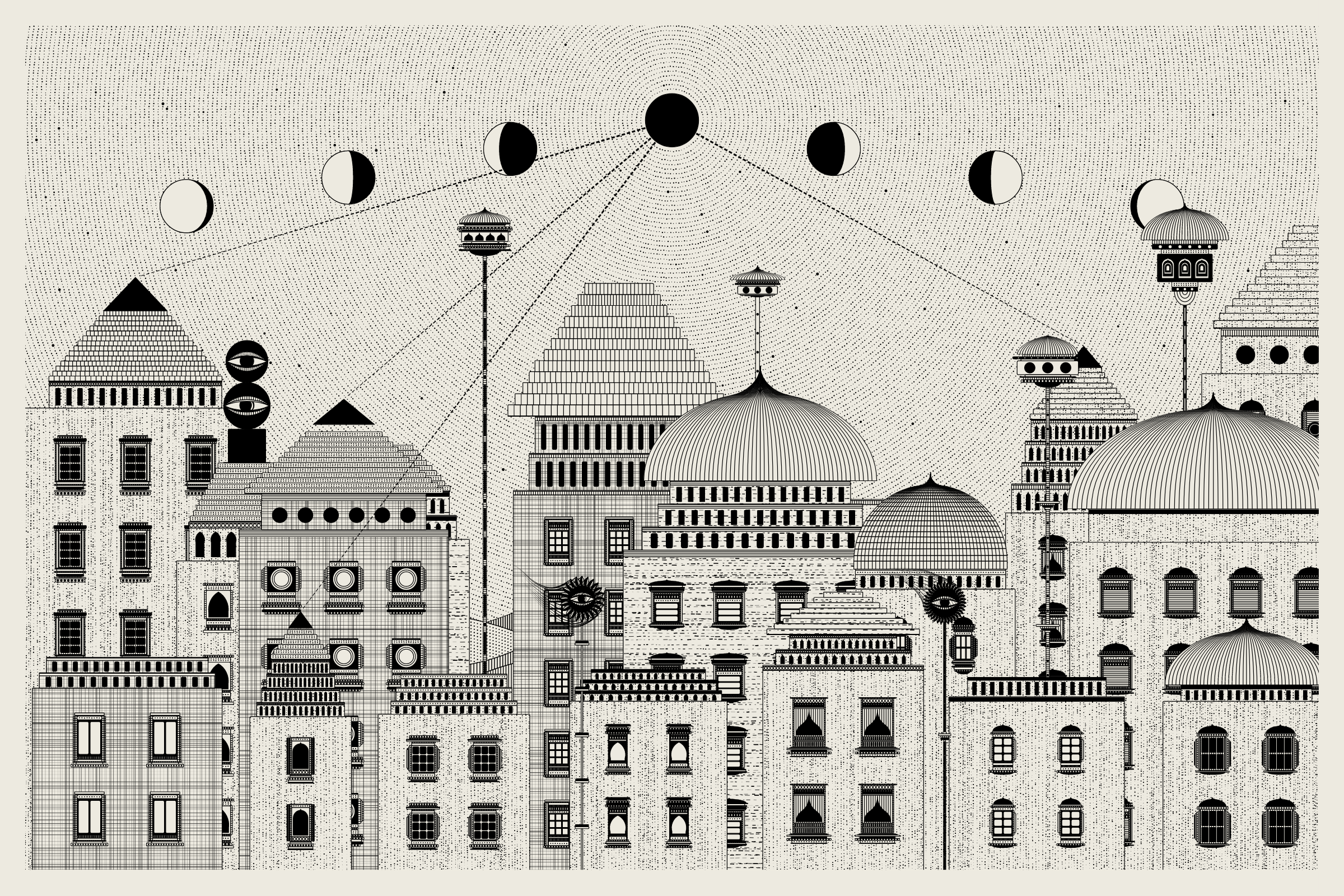 _Alan Ki Aankhen_ is an exploration of other-worldly cityscapes in the visual aesthetic of Fahad’s distinct style with pen and paper. The title, translated as _Alan’s Eyes_, alludes to Alan Turing’s machine intelligence test - a thought experiment foreshadowing a moment in which we can no longer differentiate between the real and the artificial. Though first proposed in 1950, the topic feels especially relevant today, as even our creative practices are being carried by shifting technological tides.