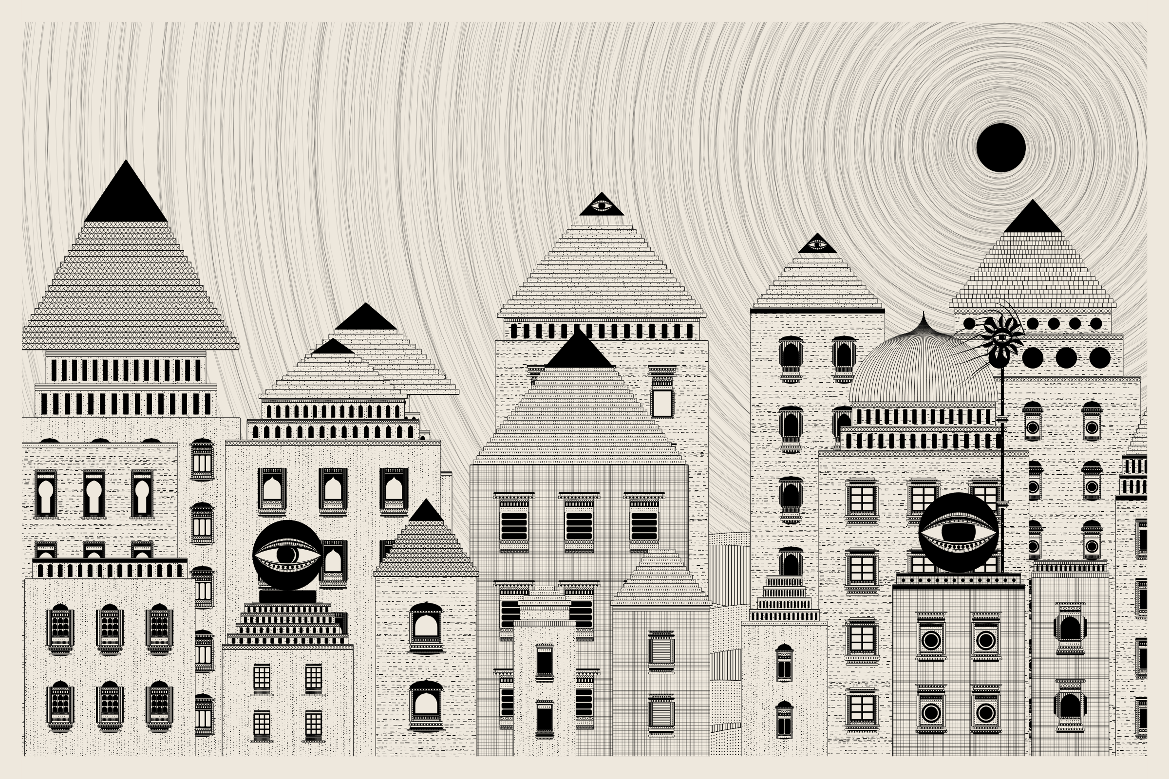 The algorithms and decision-making encoded into this generative art project intentionally imitate Fahad’s approach on traditional mediums - composition rules, textures, and overall themes. The visual elements are inspired by Fahad’s memories from his nomadic life. You’ll find intricate windows from Rajasthan, massive Egyptian pyramids rising from the horizon, a density of civilization only seen in New York, and the moon - a comforting and shared sight no matter where you stand.