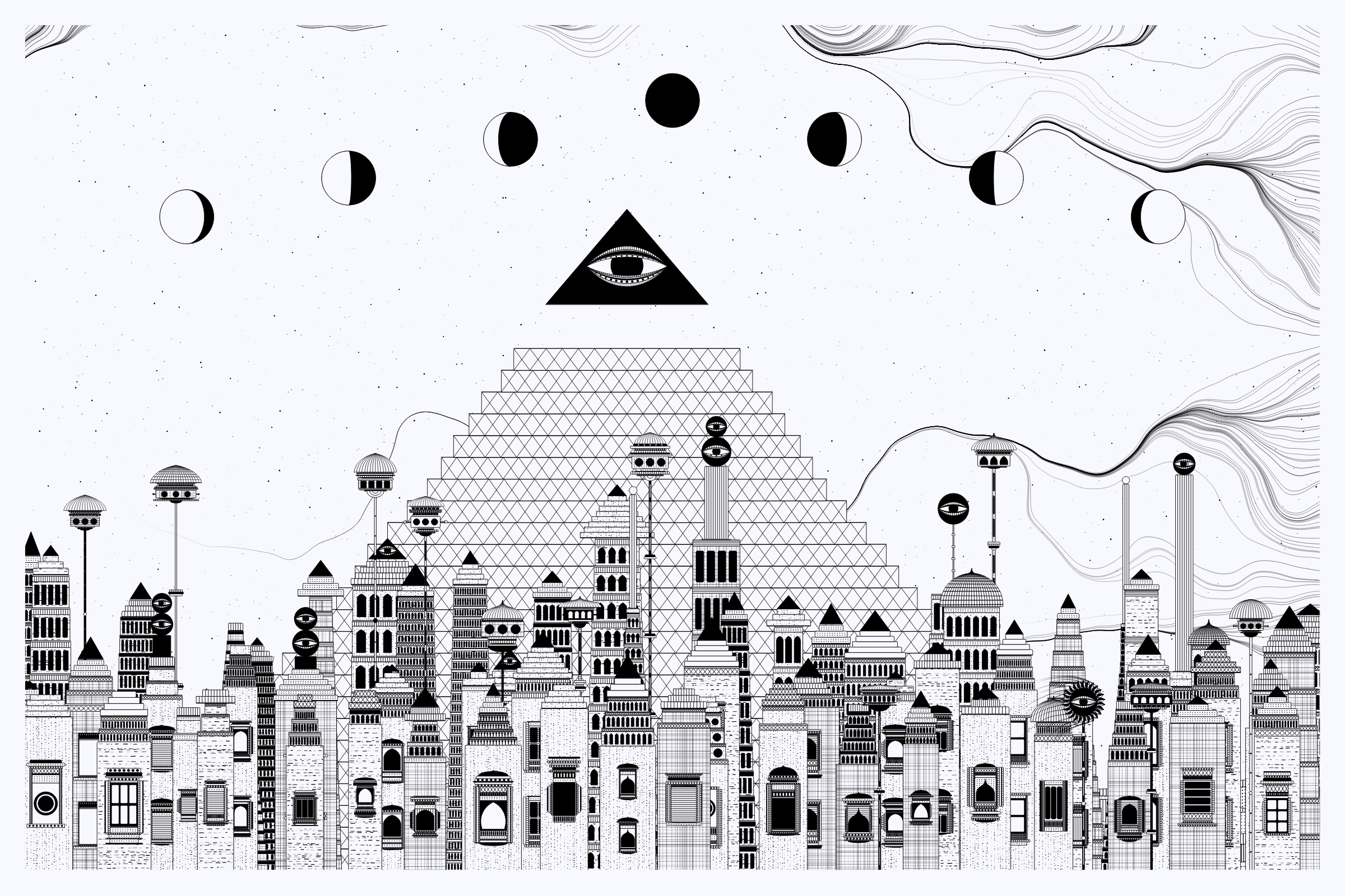 _Alan Ki Aankhen_ is an exploration of other-worldly cityscapes in the visual aesthetic of Fahad’s distinct style with pen and paper. The title, translated as _Alan’s Eyes_, alludes to Alan Turing’s machine intelligence test - a thought experiment foreshadowing a moment in which we can no longer differentiate between the real and the artificial. Though first proposed in 1950, the topic feels especially relevant today, as even our creative practices are being carried by shifting technological tides.