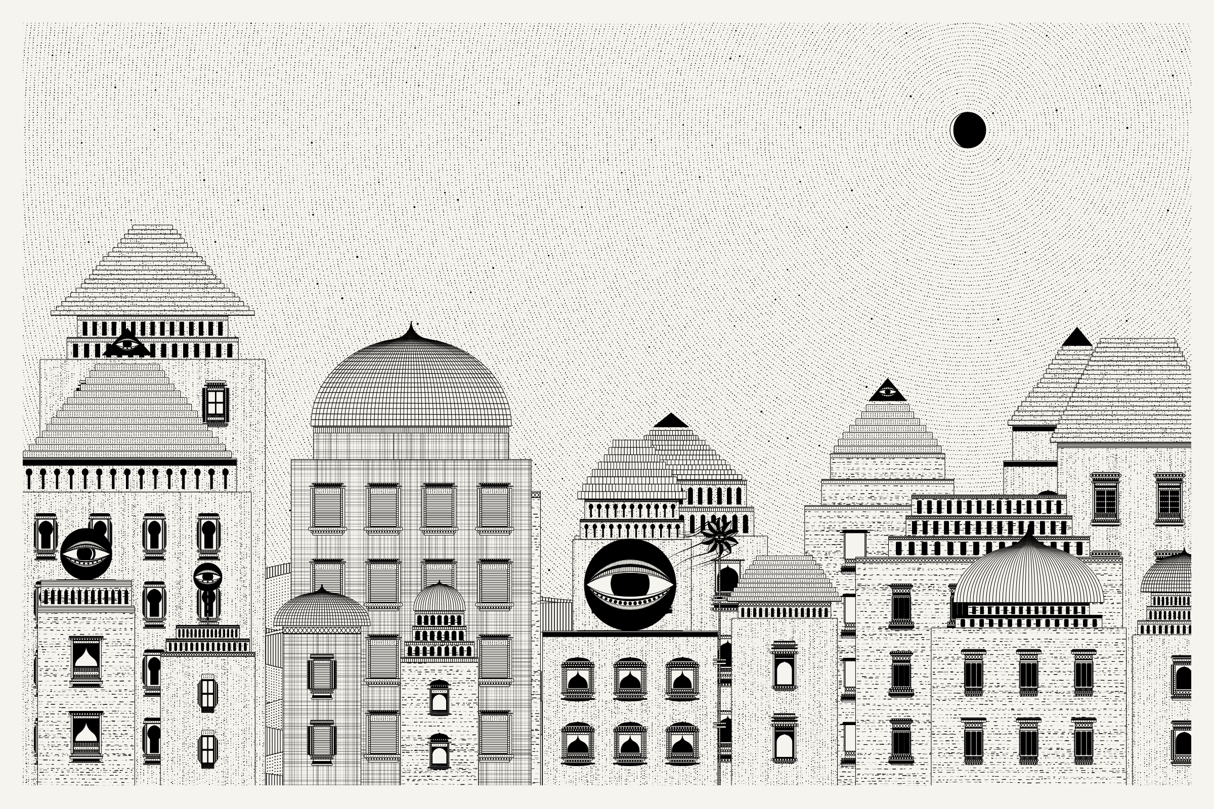 _Alan Ki Aankhen_ is an exploration of other-worldly cityscapes in the visual aesthetic of Fahad’s distinct style with pen and paper. The title, translated as _Alan’s Eyes_, alludes to Alan Turing’s machine intelligence test - a thought experiment foreshadowing a moment in which we can no longer differentiate between the real and the artificial. Though first proposed in 1950, the topic feels especially relevant today, as even our creative practices are being carried by shifting technological tides.