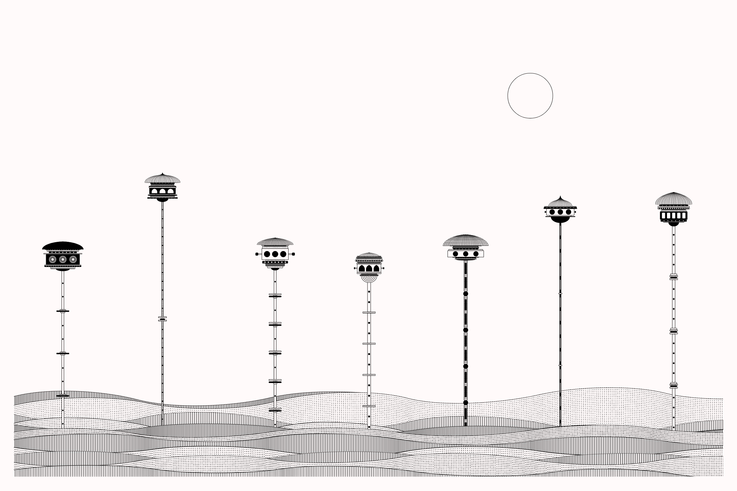 _Alan Ki Aankhen_ is an exploration of other-worldly cityscapes in the visual aesthetic of Fahad’s distinct style with pen and paper. The title, translated as _Alan’s Eyes_, alludes to Alan Turing’s machine intelligence test - a thought experiment foreshadowing a moment in which we can no longer differentiate between the real and the artificial. Though first proposed in 1950, the topic feels especially relevant today, as even our creative practices are being carried by shifting technological tides.