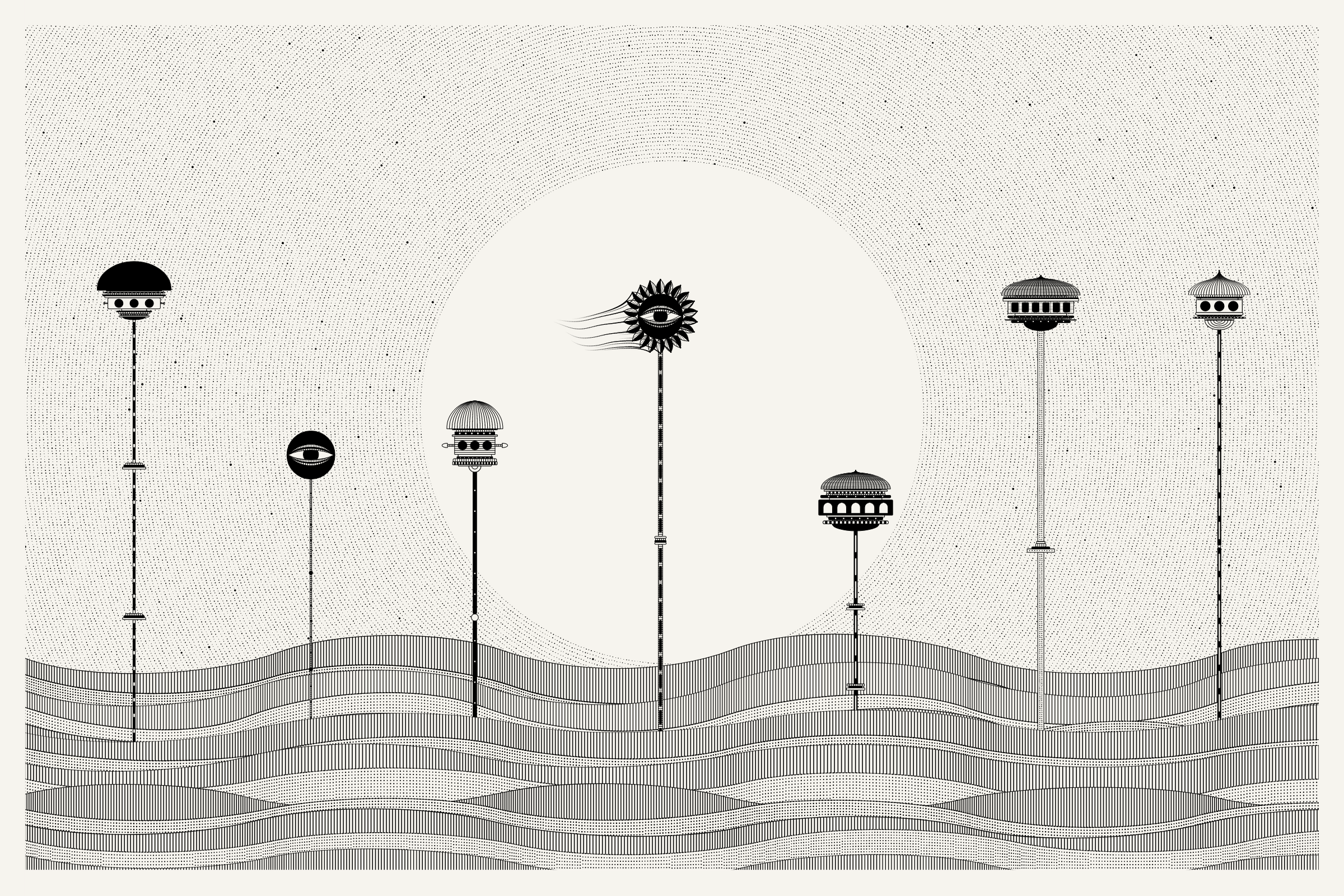 The algorithms and decision-making encoded into this generative art project intentionally imitate Fahad’s approach on traditional mediums - composition rules, textures, and overall themes. The visual elements are inspired by Fahad’s memories from his nomadic life. You’ll find intricate windows from Rajasthan, massive Egyptian pyramids rising from the horizon, a density of civilization only seen in New York, and the moon - a comforting and shared sight no matter where you stand.