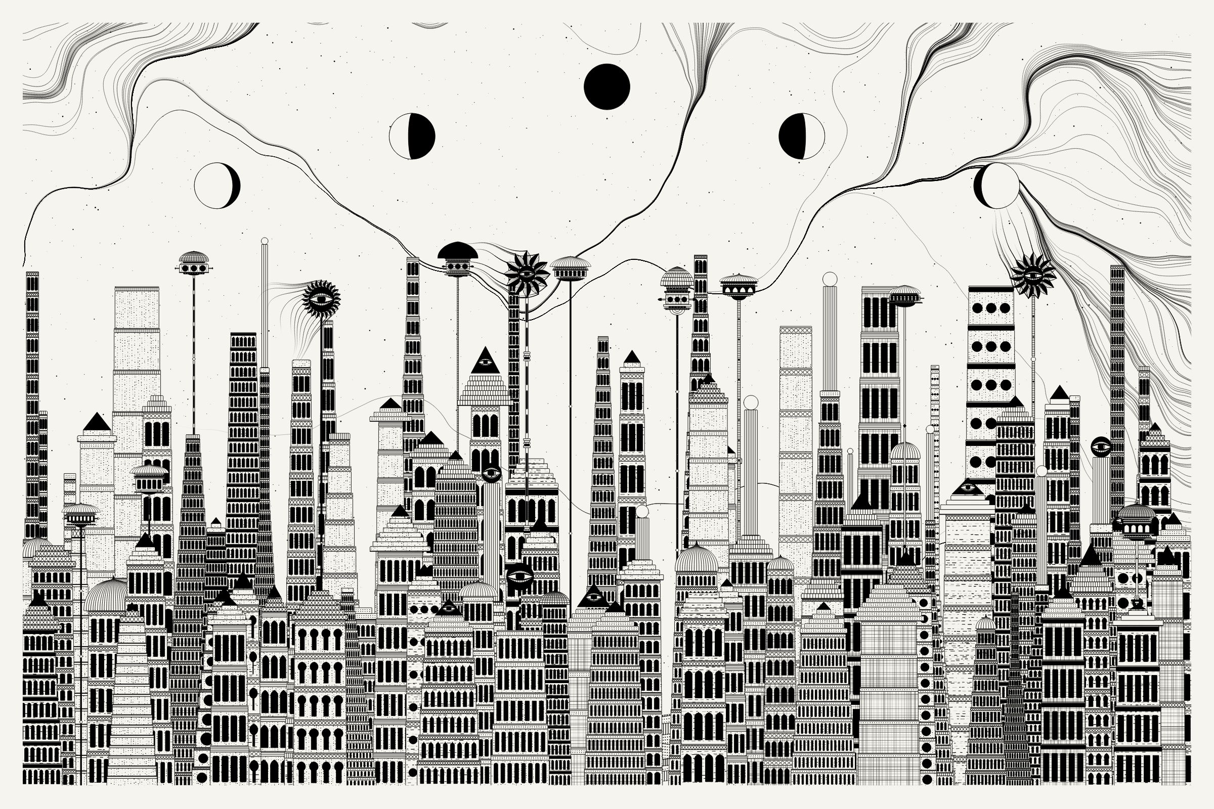 The algorithms and decision-making encoded into this generative art project intentionally imitate Fahad’s approach on traditional mediums - composition rules, textures, and overall themes. The visual elements are inspired by Fahad’s memories from his nomadic life. You’ll find intricate windows from Rajasthan, massive Egyptian pyramids rising from the horizon, a density of civilization only seen in New York, and the moon - a comforting and shared sight no matter where you stand.