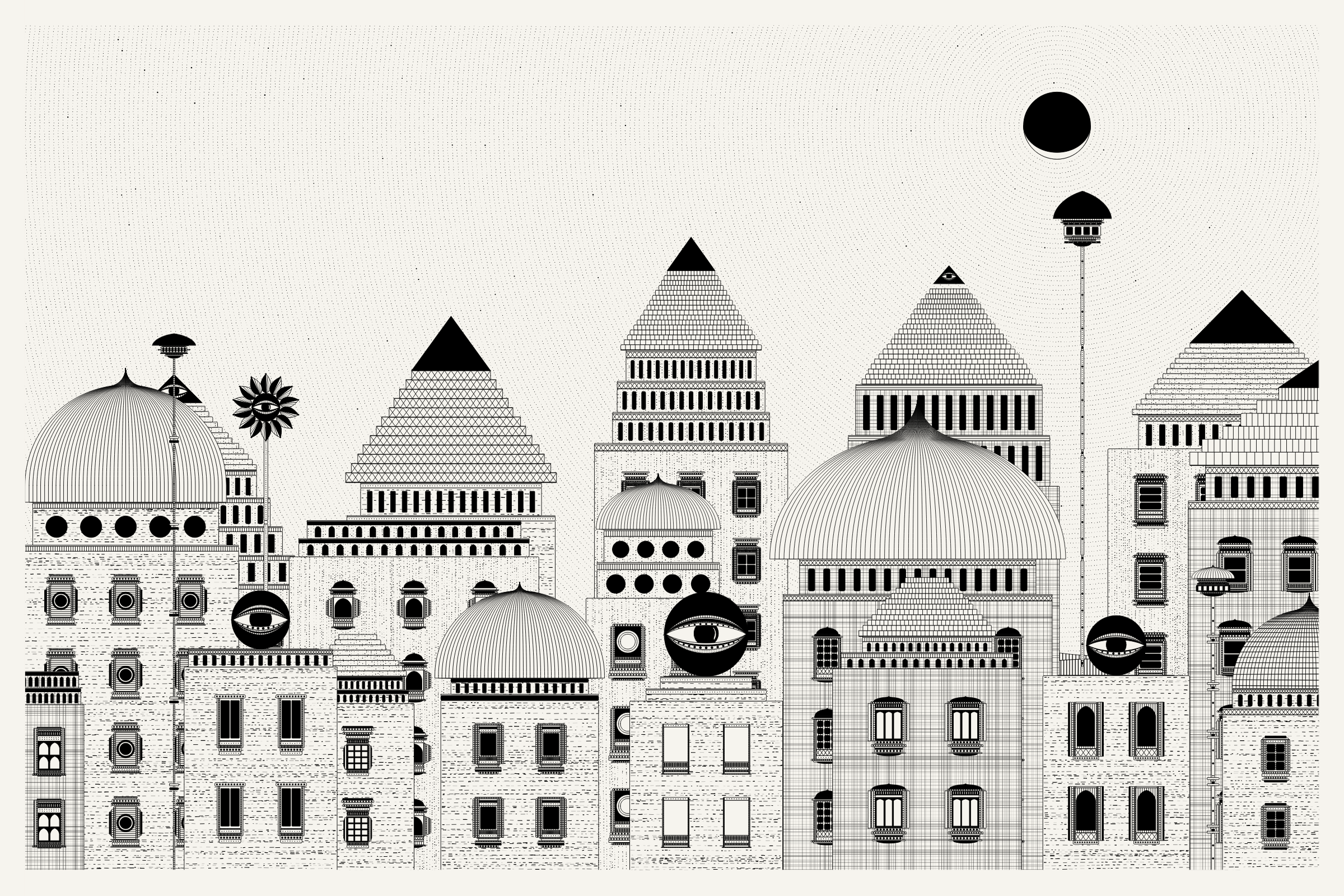 _Alan Ki Aankhen_ is an exploration of other-worldly cityscapes in the visual aesthetic of Fahad’s distinct style with pen and paper. The title, translated as _Alan’s Eyes_, alludes to Alan Turing’s machine intelligence test - a thought experiment foreshadowing a moment in which we can no longer differentiate between the real and the artificial. Though first proposed in 1950, the topic feels especially relevant today, as even our creative practices are being carried by shifting technological tides.