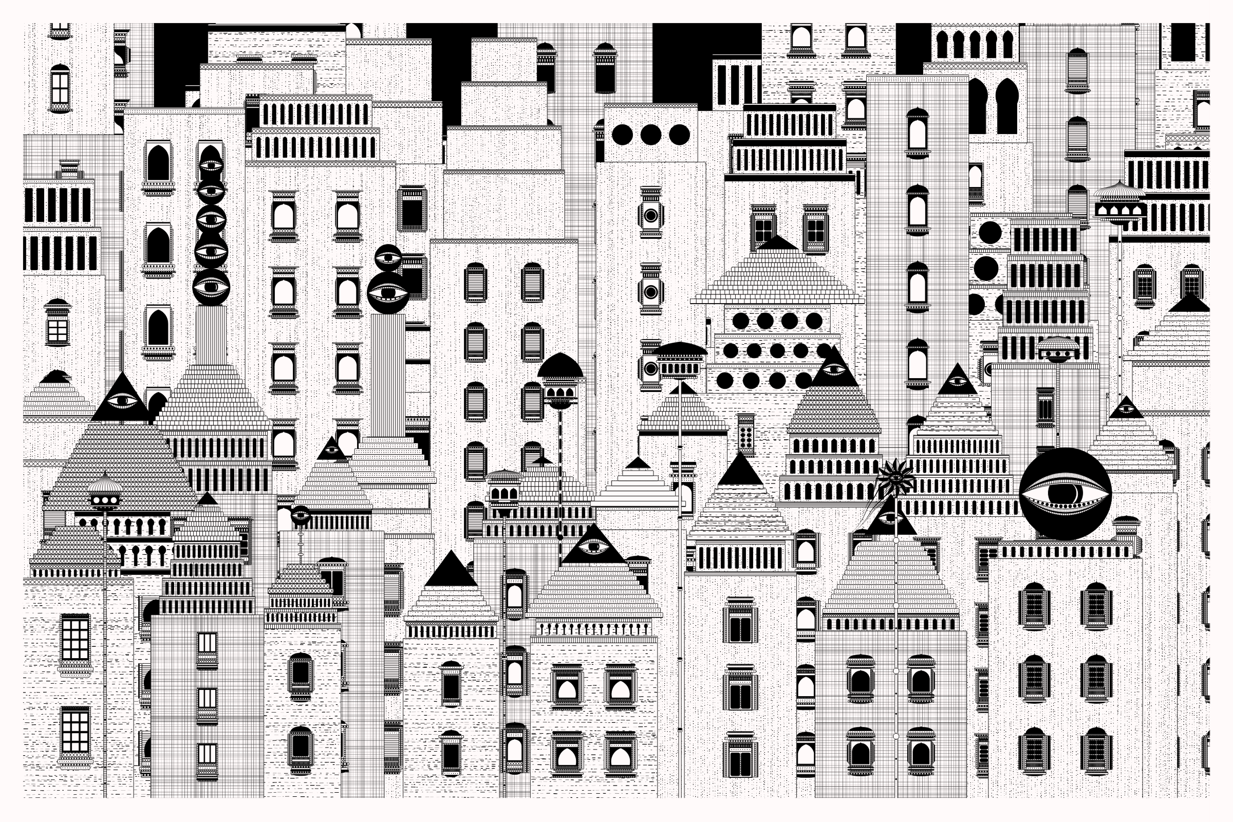 _Alan Ki Aankhen_ is an exploration of other-worldly cityscapes in the visual aesthetic of Fahad’s distinct style with pen and paper. The title, translated as _Alan’s Eyes_, alludes to Alan Turing’s machine intelligence test - a thought experiment foreshadowing a moment in which we can no longer differentiate between the real and the artificial. Though first proposed in 1950, the topic feels especially relevant today, as even our creative practices are being carried by shifting technological tides.