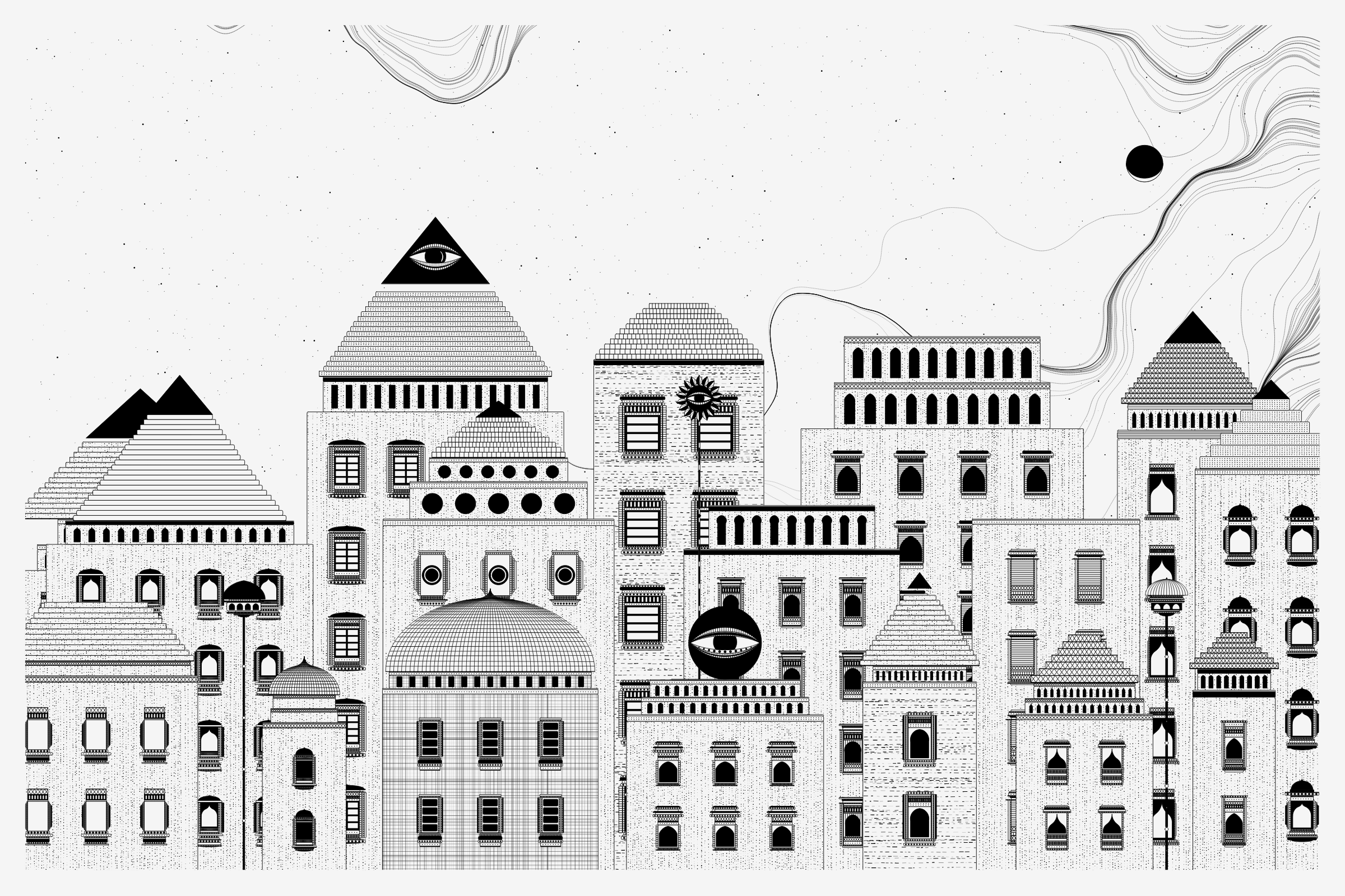 The algorithms and decision-making encoded into this generative art project intentionally imitate Fahad’s approach on traditional mediums - composition rules, textures, and overall themes. The visual elements are inspired by Fahad’s memories from his nomadic life. You’ll find intricate windows from Rajasthan, massive Egyptian pyramids rising from the horizon, a density of civilization only seen in New York, and the moon - a comforting and shared sight no matter where you stand.