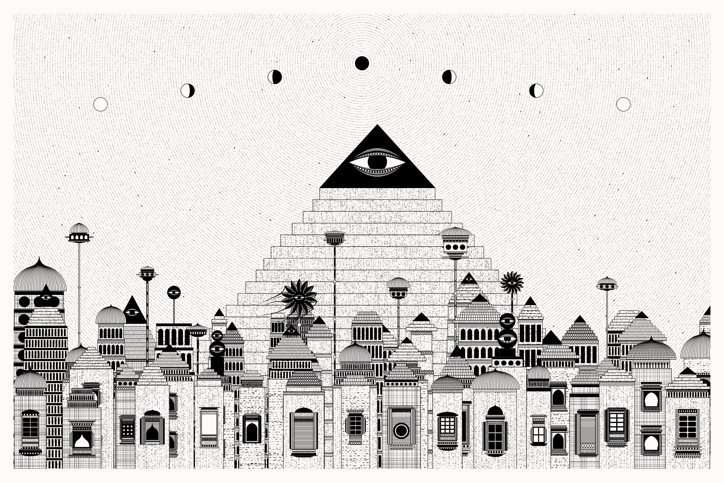 _Alan Ki Aankhen_ is an exploration of other-worldly cityscapes in the visual aesthetic of Fahad’s distinct style with pen and paper. The title, translated as _Alan’s Eyes_, alludes to Alan Turing’s machine intelligence test - a thought experiment foreshadowing a moment in which we can no longer differentiate between the real and the artificial. Though first proposed in 1950, the topic feels especially relevant today, as even our creative practices are being carried by shifting technological tides.
