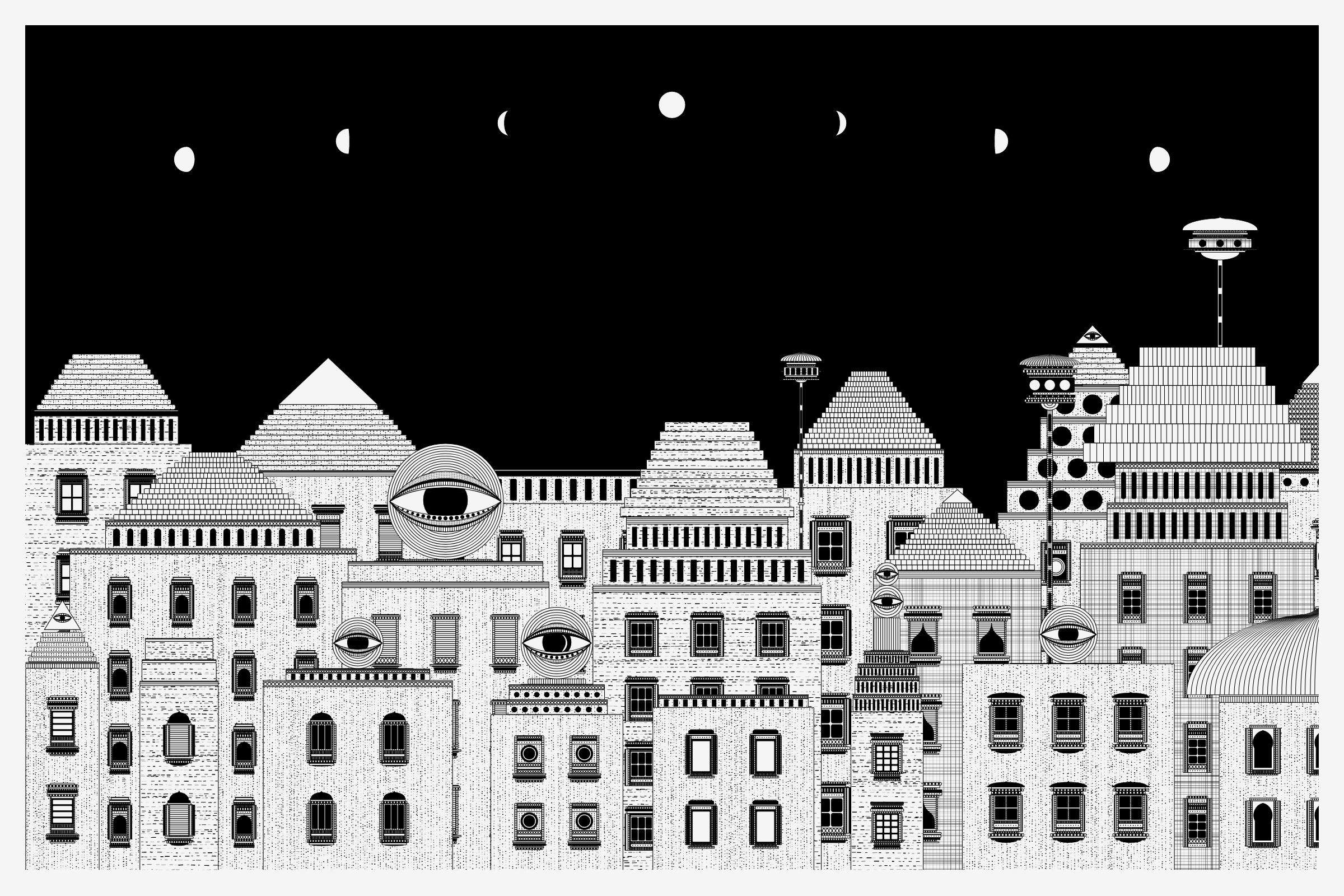 _Alan Ki Aankhen_ is an exploration of other-worldly cityscapes in the visual aesthetic of Fahad’s distinct style with pen and paper. The title, translated as _Alan’s Eyes_, alludes to Alan Turing’s machine intelligence test - a thought experiment foreshadowing a moment in which we can no longer differentiate between the real and the artificial. Though first proposed in 1950, the topic feels especially relevant today, as even our creative practices are being carried by shifting technological tides.