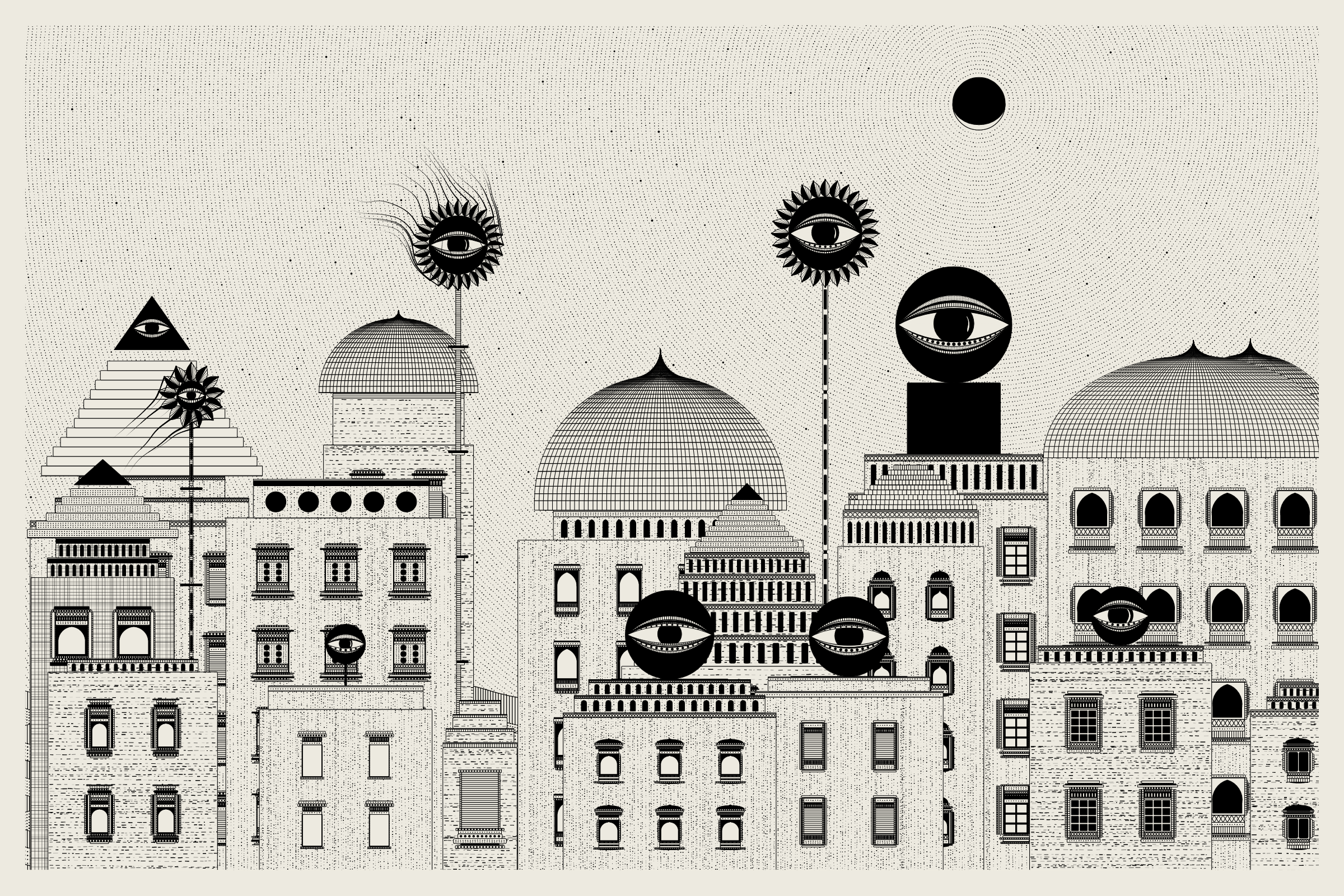 The algorithms and decision-making encoded into this generative art project intentionally imitate Fahad’s approach on traditional mediums - composition rules, textures, and overall themes. The visual elements are inspired by Fahad’s memories from his nomadic life. You’ll find intricate windows from Rajasthan, massive Egyptian pyramids rising from the horizon, a density of civilization only seen in New York, and the moon - a comforting and shared sight no matter where you stand.