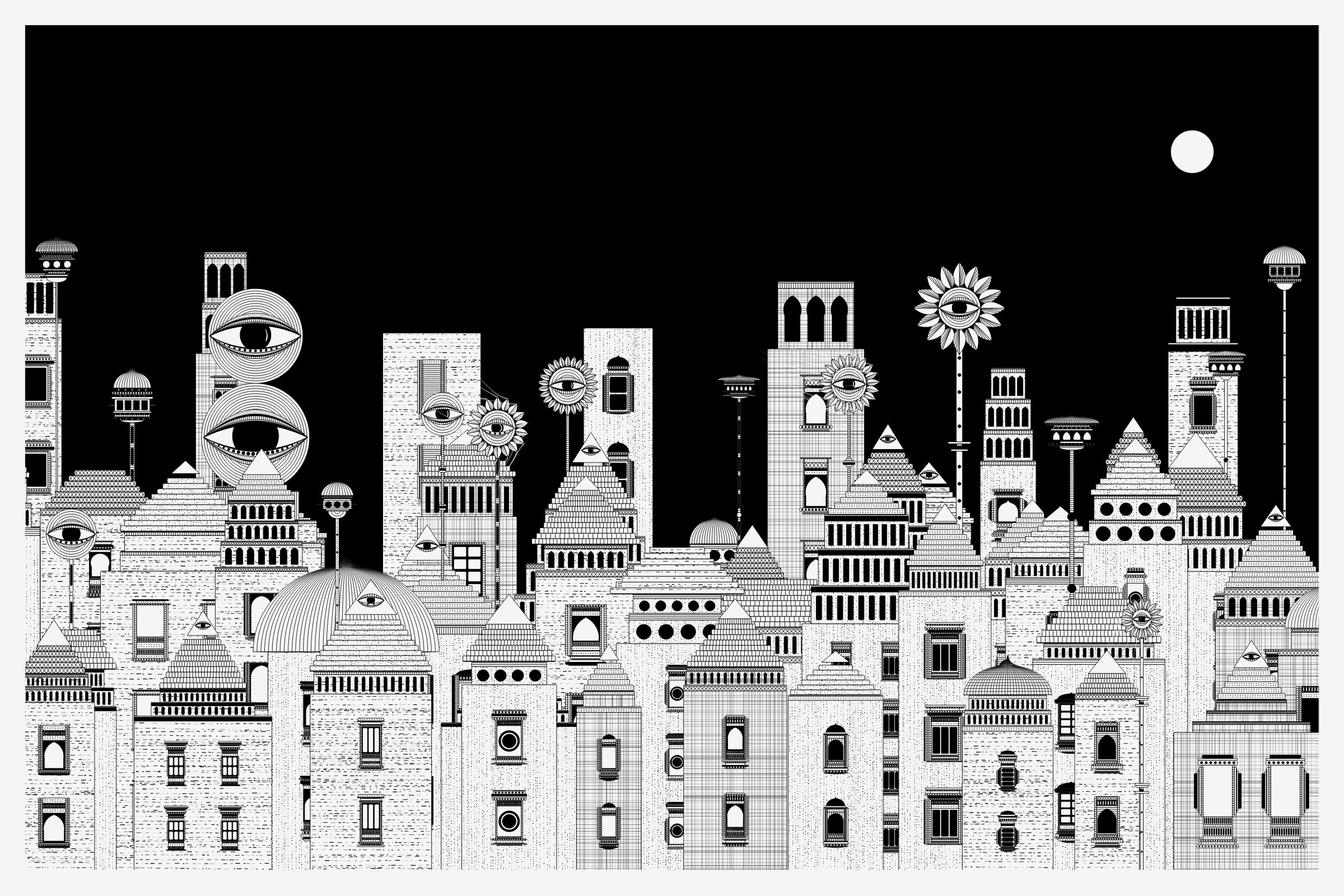 _Alan Ki Aankhen_ is an exploration of other-worldly cityscapes in the visual aesthetic of Fahad’s distinct style with pen and paper. The title, translated as _Alan’s Eyes_, alludes to Alan Turing’s machine intelligence test - a thought experiment foreshadowing a moment in which we can no longer differentiate between the real and the artificial. Though first proposed in 1950, the topic feels especially relevant today, as even our creative practices are being carried by shifting technological tides.