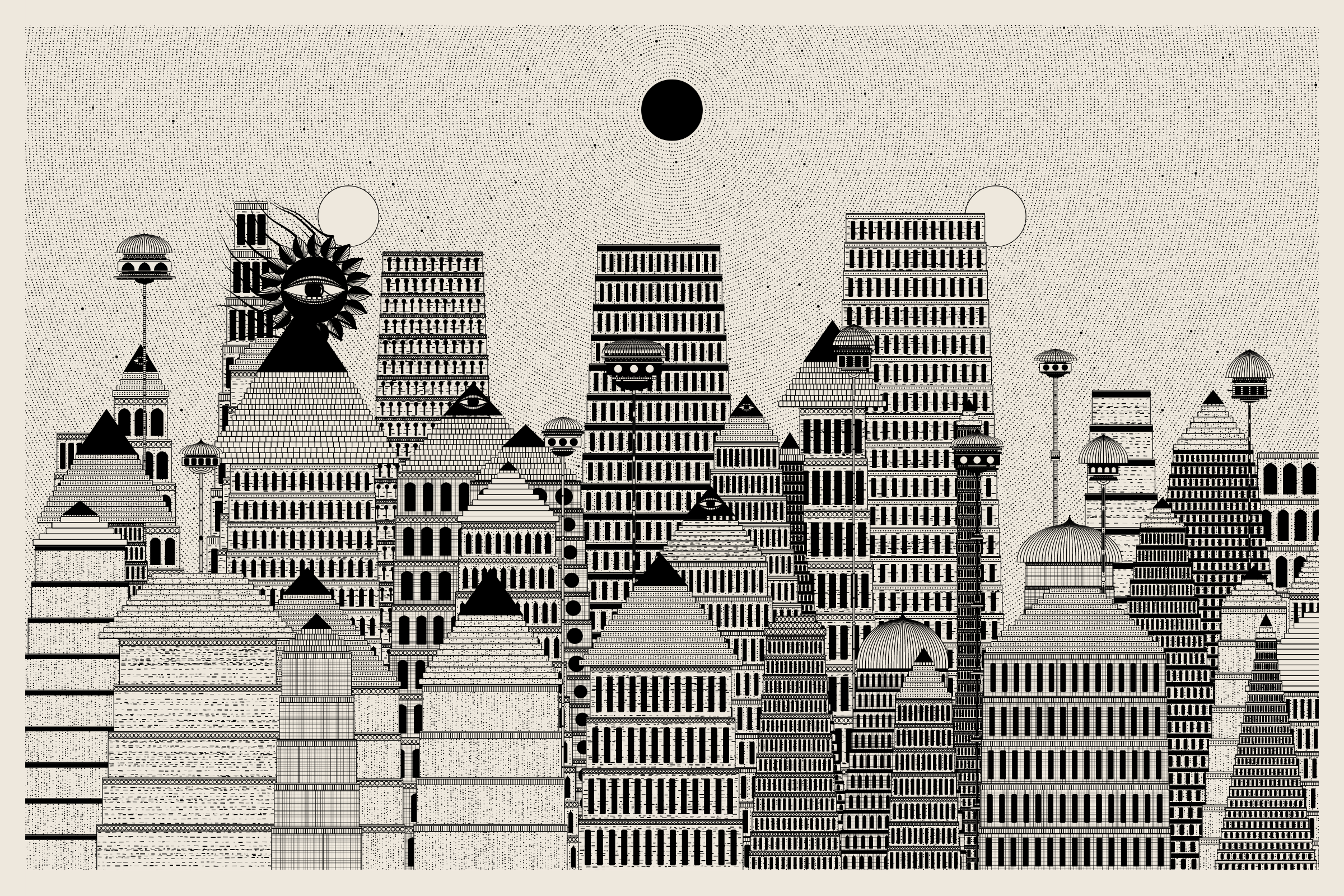 _Alan Ki Aankhen_ is an exploration of other-worldly cityscapes in the visual aesthetic of Fahad’s distinct style with pen and paper. The title, translated as _Alan’s Eyes_, alludes to Alan Turing’s machine intelligence test - a thought experiment foreshadowing a moment in which we can no longer differentiate between the real and the artificial. Though first proposed in 1950, the topic feels especially relevant today, as even our creative practices are being carried by shifting technological tides.