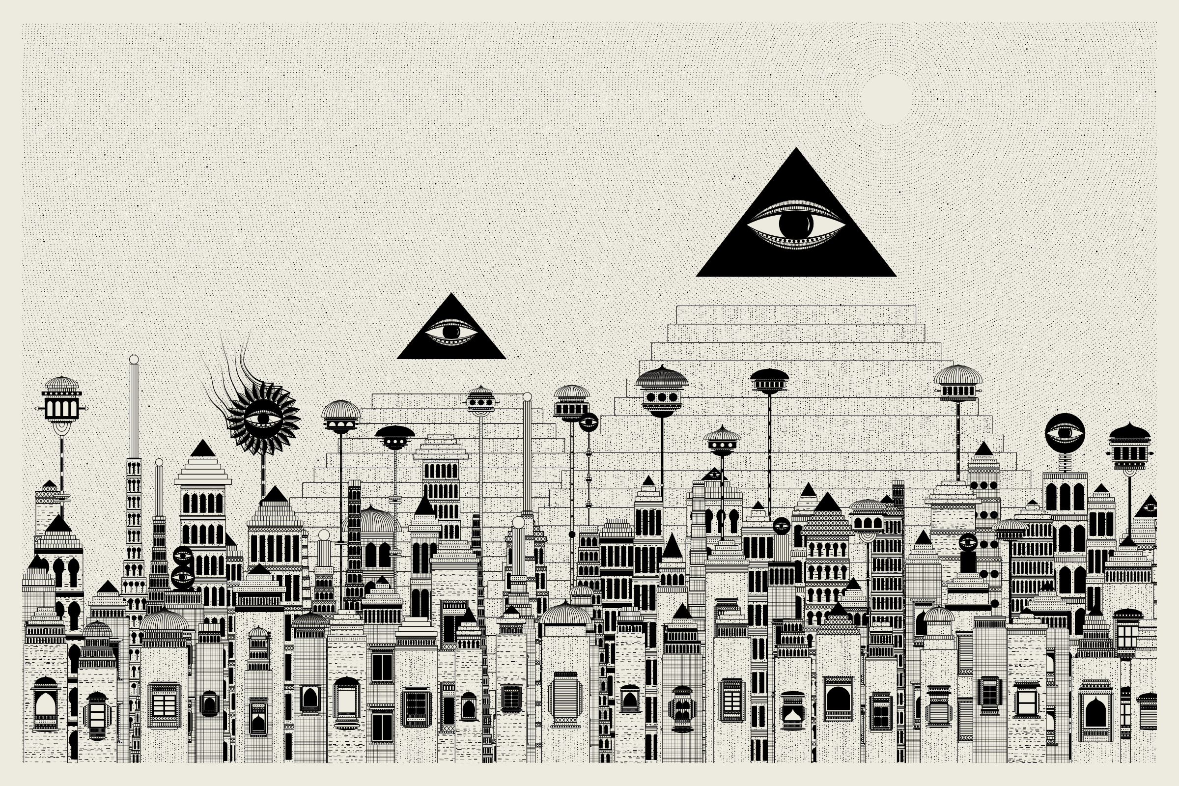 _Alan Ki Aankhen_ is an exploration of other-worldly cityscapes in the visual aesthetic of Fahad’s distinct style with pen and paper. The title, translated as _Alan’s Eyes_, alludes to Alan Turing’s machine intelligence test - a thought experiment foreshadowing a moment in which we can no longer differentiate between the real and the artificial. Though first proposed in 1950, the topic feels especially relevant today, as even our creative practices are being carried by shifting technological tides.
