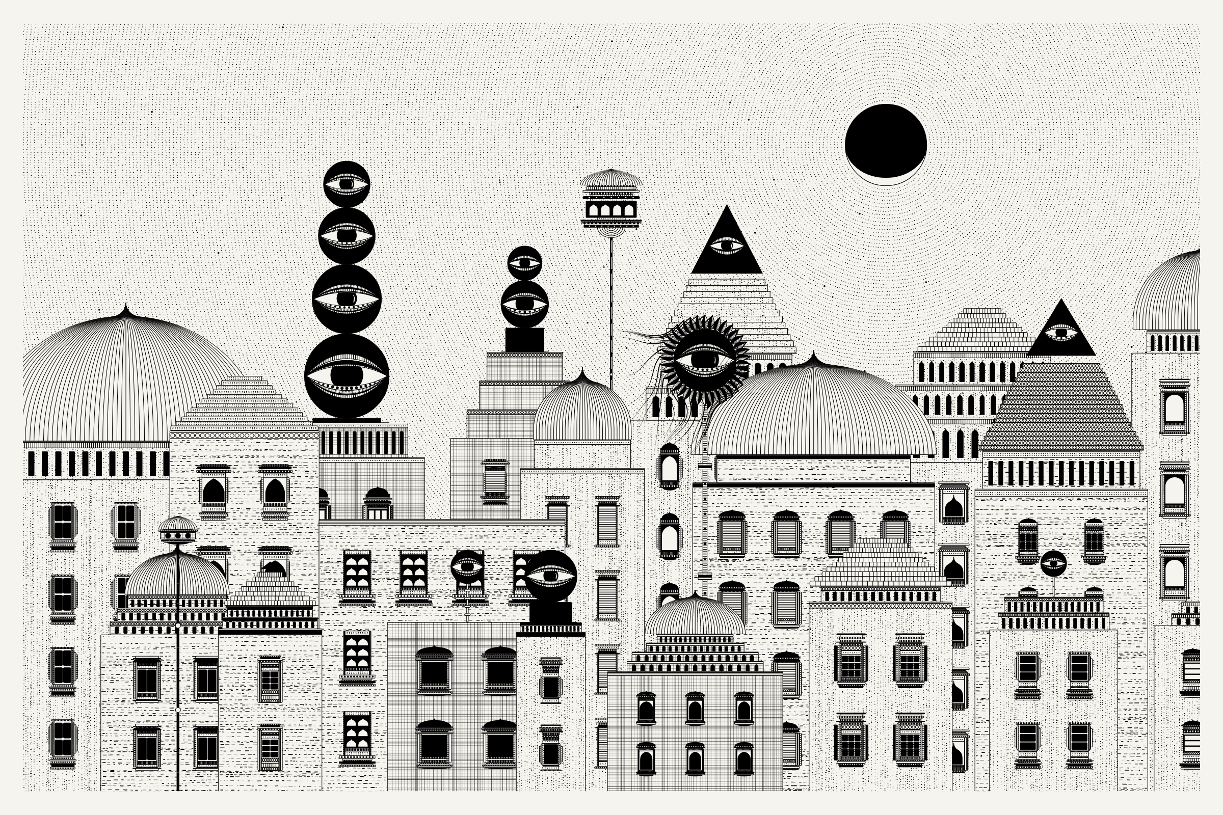 The algorithms and decision-making encoded into this generative art project intentionally imitate Fahad’s approach on traditional mediums - composition rules, textures, and overall themes. The visual elements are inspired by Fahad’s memories from his nomadic life. You’ll find intricate windows from Rajasthan, massive Egyptian pyramids rising from the horizon, a density of civilization only seen in New York, and the moon - a comforting and shared sight no matter where you stand.