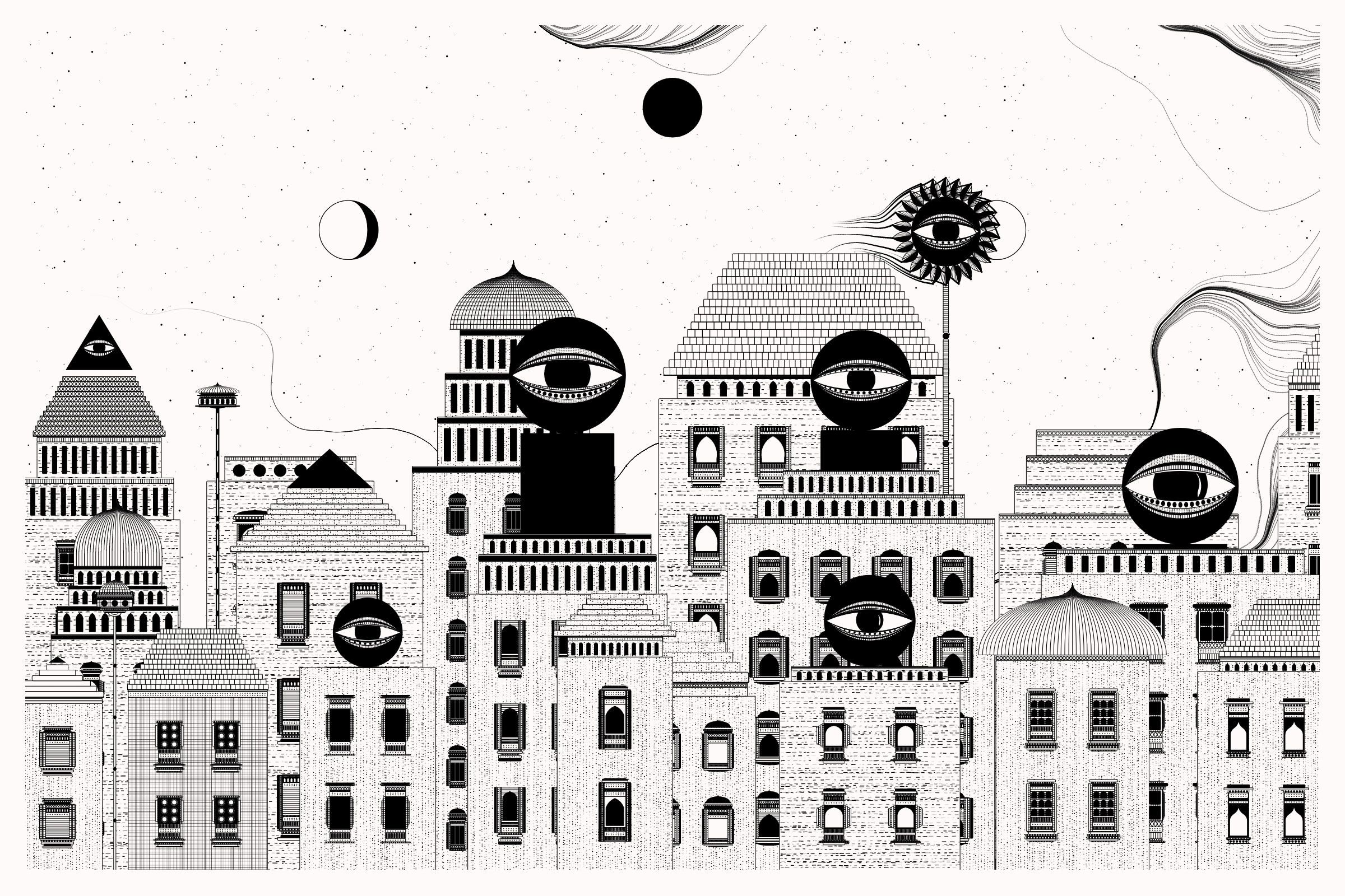 The algorithms and decision-making encoded into this generative art project intentionally imitate Fahad’s approach on traditional mediums - composition rules, textures, and overall themes. The visual elements are inspired by Fahad’s memories from his nomadic life. You’ll find intricate windows from Rajasthan, massive Egyptian pyramids rising from the horizon, a density of civilization only seen in New York, and the moon - a comforting and shared sight no matter where you stand.
