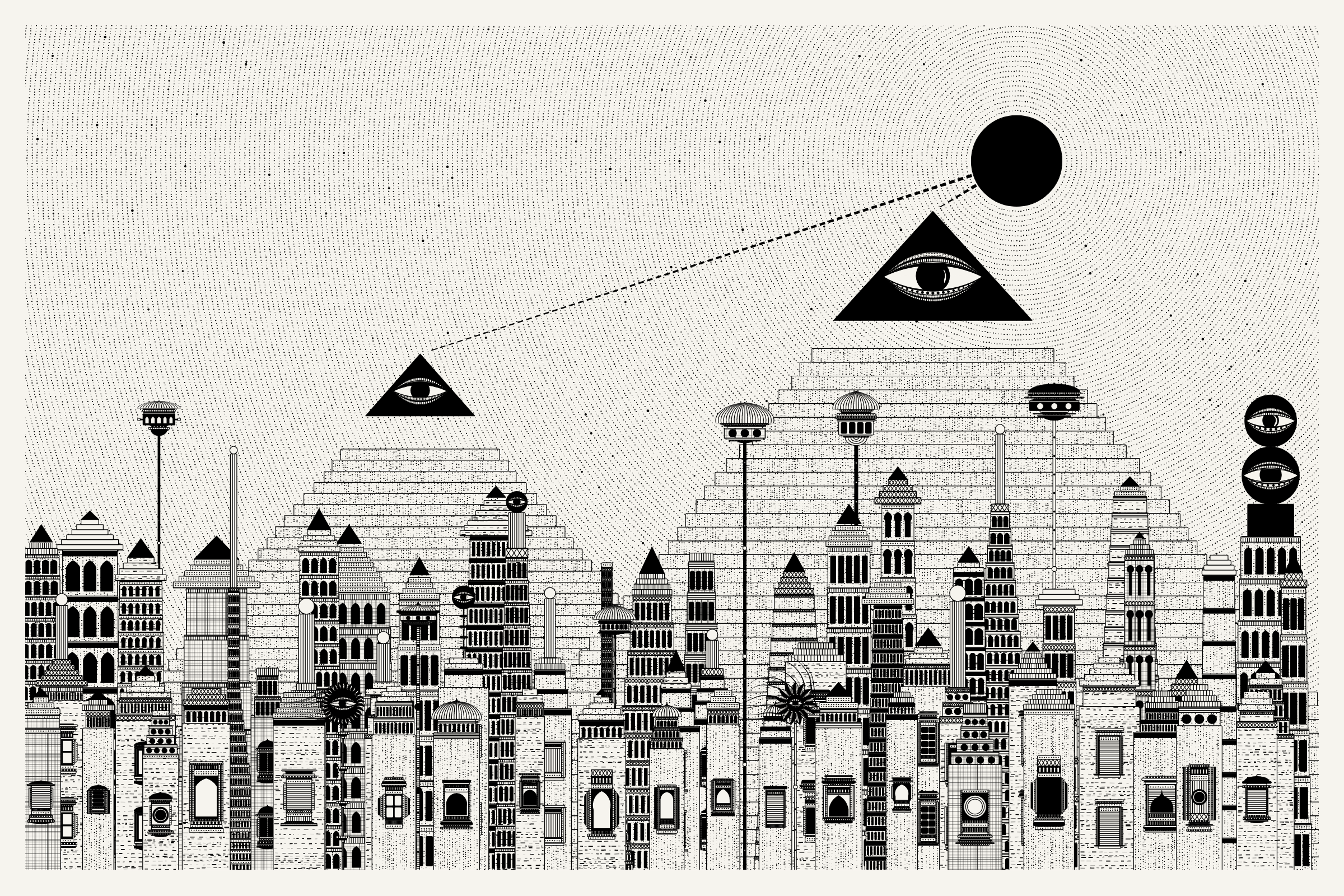 _Alan Ki Aankhen_ is an exploration of other-worldly cityscapes in the visual aesthetic of Fahad’s distinct style with pen and paper. The title, translated as _Alan’s Eyes_, alludes to Alan Turing’s machine intelligence test - a thought experiment foreshadowing a moment in which we can no longer differentiate between the real and the artificial. Though first proposed in 1950, the topic feels especially relevant today, as even our creative practices are being carried by shifting technological tides.
