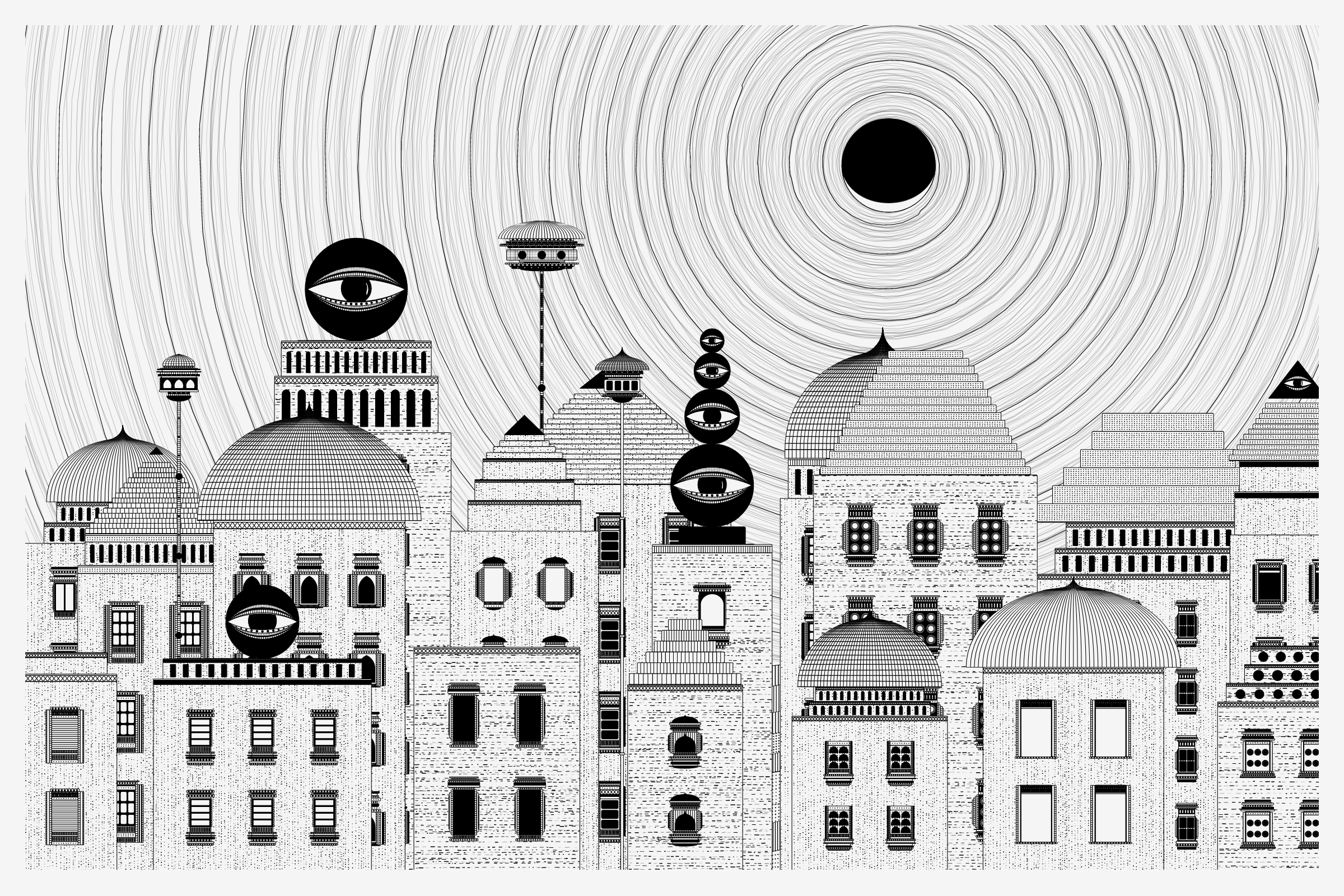 _Alan Ki Aankhen_ is an exploration of other-worldly cityscapes in the visual aesthetic of Fahad’s distinct style with pen and paper. The title, translated as _Alan’s Eyes_, alludes to Alan Turing’s machine intelligence test - a thought experiment foreshadowing a moment in which we can no longer differentiate between the real and the artificial. Though first proposed in 1950, the topic feels especially relevant today, as even our creative practices are being carried by shifting technological tides.