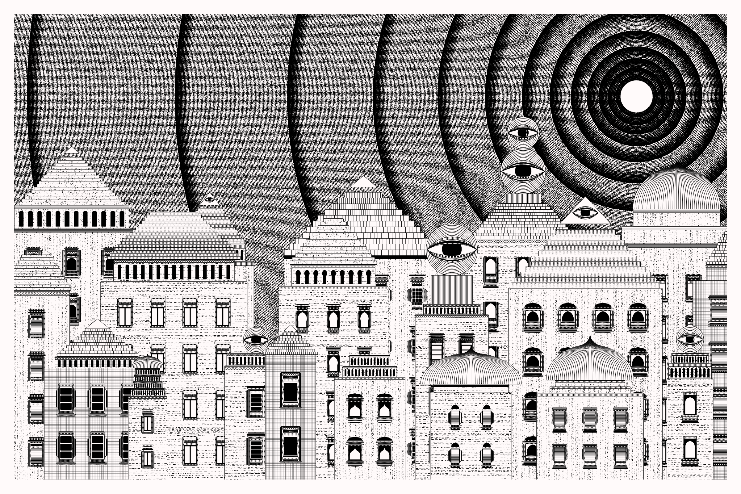 _Alan Ki Aankhen_ is an exploration of other-worldly cityscapes in the visual aesthetic of Fahad’s distinct style with pen and paper. The title, translated as _Alan’s Eyes_, alludes to Alan Turing’s machine intelligence test - a thought experiment foreshadowing a moment in which we can no longer differentiate between the real and the artificial. Though first proposed in 1950, the topic feels especially relevant today, as even our creative practices are being carried by shifting technological tides.
