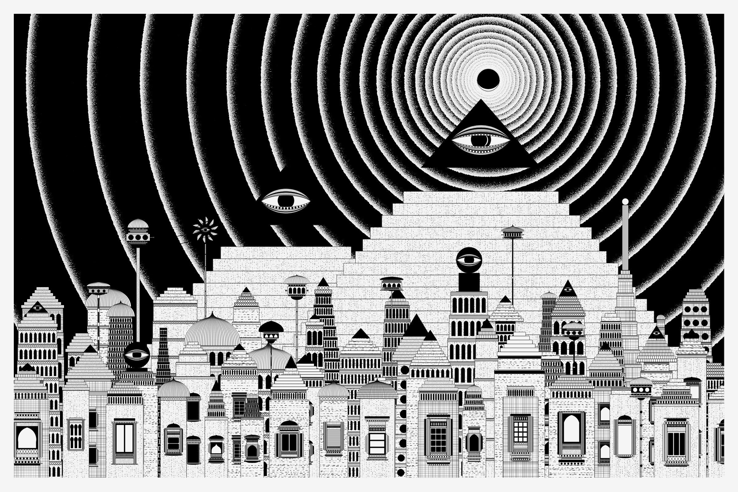 _Alan Ki Aankhen_ is an exploration of other-worldly cityscapes in the visual aesthetic of Fahad’s distinct style with pen and paper. The title, translated as _Alan’s Eyes_, alludes to Alan Turing’s machine intelligence test - a thought experiment foreshadowing a moment in which we can no longer differentiate between the real and the artificial. Though first proposed in 1950, the topic feels especially relevant today, as even our creative practices are being carried by shifting technological tides.