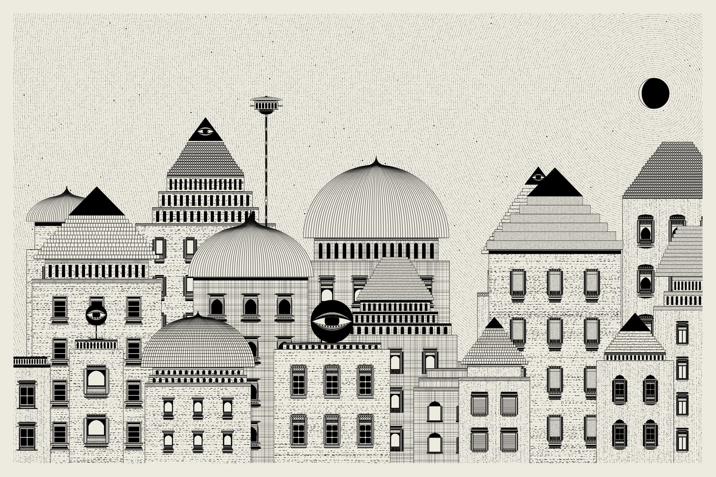 The algorithms and decision-making encoded into this generative art project intentionally imitate Fahad’s approach on traditional mediums - composition rules, textures, and overall themes. The visual elements are inspired by Fahad’s memories from his nomadic life. You’ll find intricate windows from Rajasthan, massive Egyptian pyramids rising from the horizon, a density of civilization only seen in New York, and the moon - a comforting and shared sight no matter where you stand.