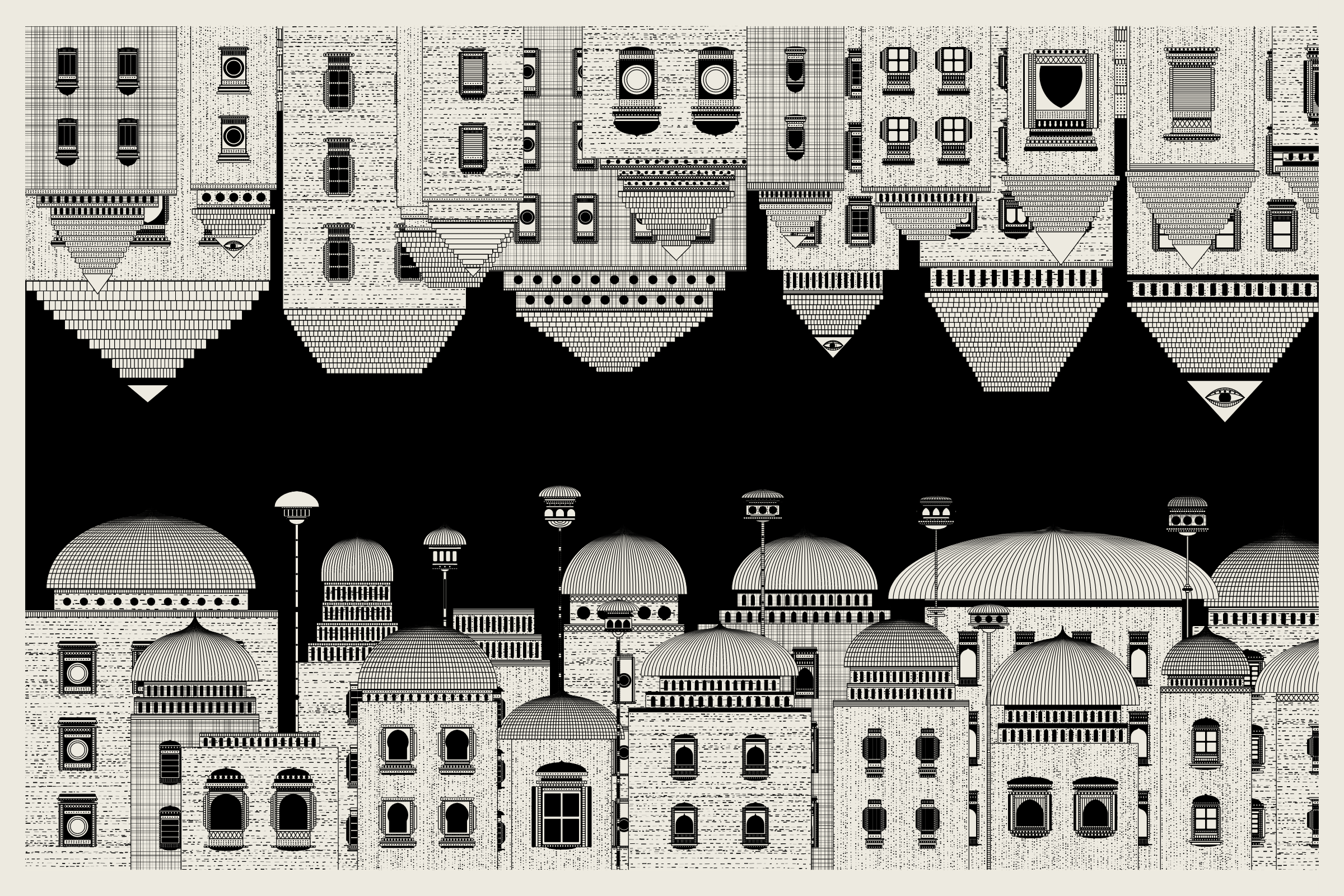 _Alan Ki Aankhen_ is an exploration of other-worldly cityscapes in the visual aesthetic of Fahad’s distinct style with pen and paper. The title, translated as _Alan’s Eyes_, alludes to Alan Turing’s machine intelligence test - a thought experiment foreshadowing a moment in which we can no longer differentiate between the real and the artificial. Though first proposed in 1950, the topic feels especially relevant today, as even our creative practices are being carried by shifting technological tides.