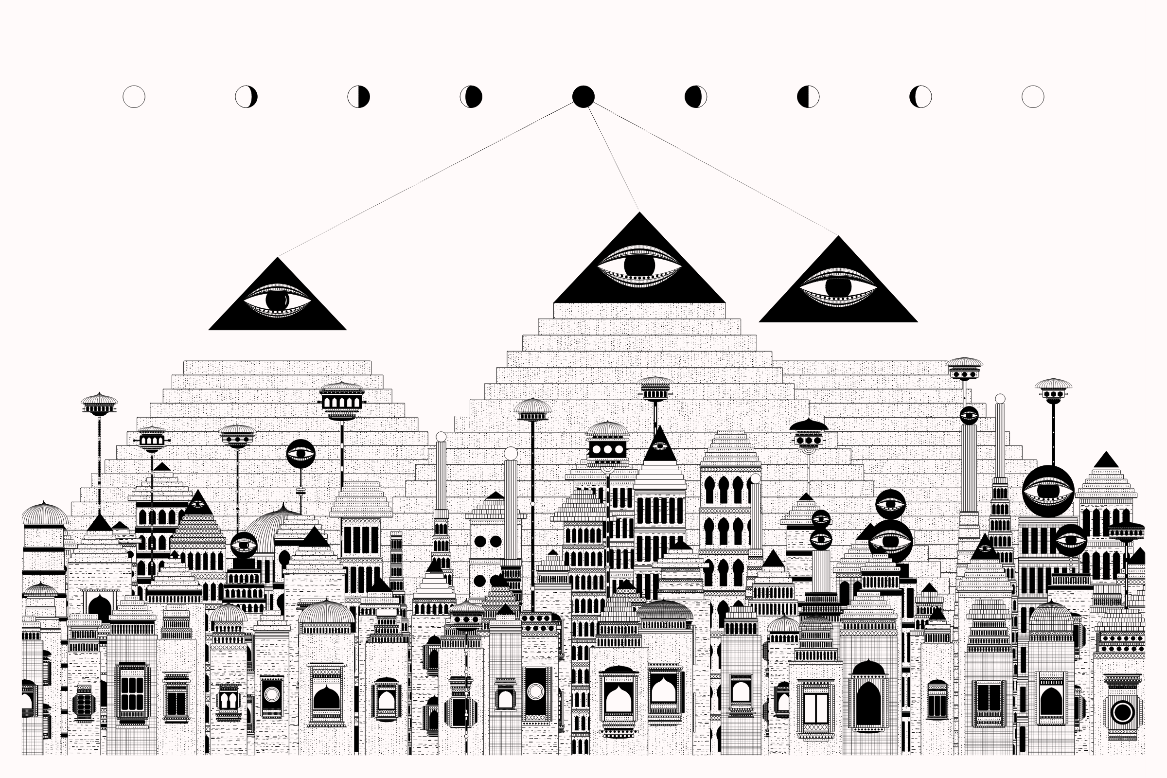 The algorithms and decision-making encoded into this generative art project intentionally imitate Fahad’s approach on traditional mediums - composition rules, textures, and overall themes. The visual elements are inspired by Fahad’s memories from his nomadic life. You’ll find intricate windows from Rajasthan, massive Egyptian pyramids rising from the horizon, a density of civilization only seen in New York, and the moon - a comforting and shared sight no matter where you stand.