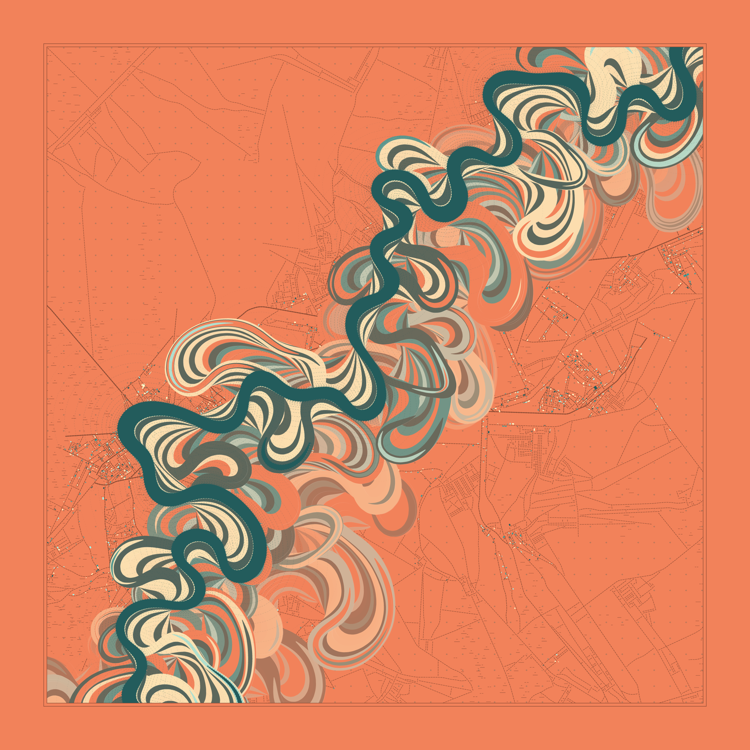 Ancient Courses is a generative experience that explores the aesthetics of meandering rivers and the settlements that form on their banks. The design is graphic and cartographic with bold color palettes rendered against map iconography and line sensibility. From the river banks, roads stretch across the landscape: sometimes a single access road, other times sprawling towns. The river meandering is simulated via a custom algorithm which closely models the real world process.