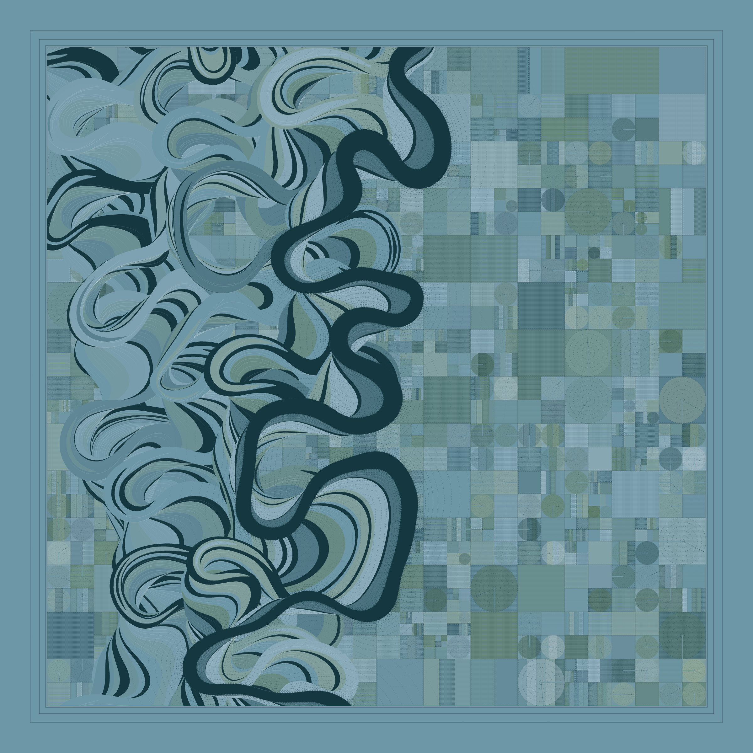 Ancient Courses is a generative experience that explores the aesthetics of meandering rivers and the settlements that form on their banks. The design is graphic and cartographic with bold color palettes rendered against map iconography and line sensibility. From the river banks, roads stretch across the landscape: sometimes a single access road, other times sprawling towns. The river meandering is simulated via a custom algorithm which closely models the real world process.