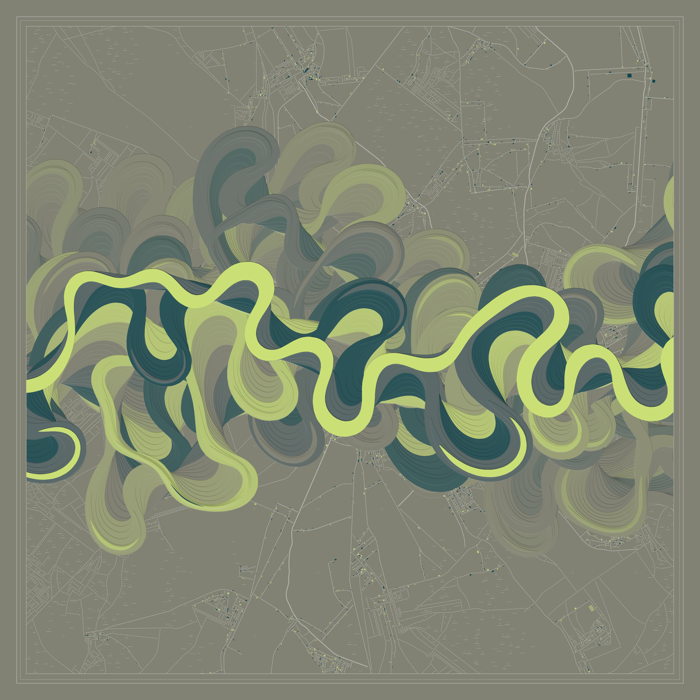 Ancient Courses is a generative experience that explores the aesthetics of meandering rivers and the settlements that form on their banks. The design is graphic and cartographic with bold color palettes rendered against map iconography and line sensibility. From the river banks, roads stretch across the landscape: sometimes a single access road, other times sprawling towns. The river meandering is simulated via a custom algorithm which closely models the real world process.