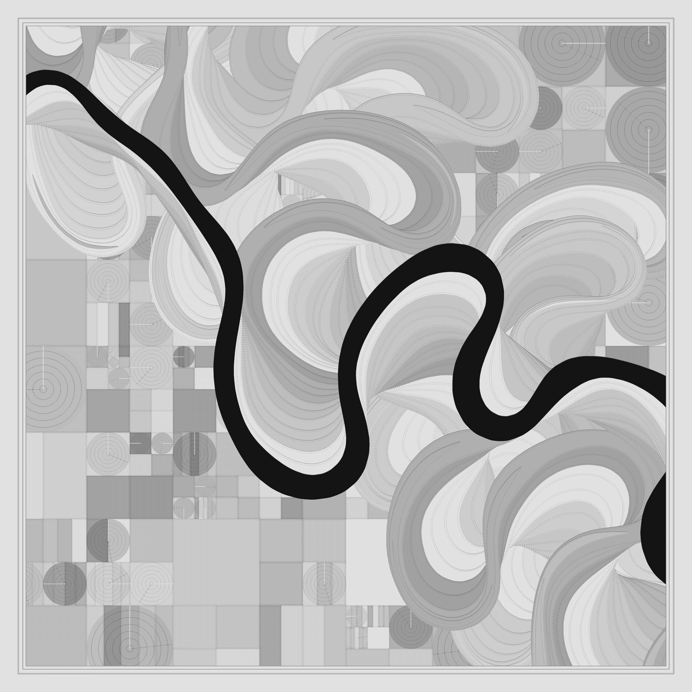 Ancient Courses is a generative experience that explores the aesthetics of meandering rivers and the settlements that form on their banks. The design is graphic and cartographic with bold color palettes rendered against map iconography and line sensibility. From the river banks, roads stretch across the landscape: sometimes a single access road, other times sprawling towns. The river meandering is simulated via a custom algorithm which closely models the real world process.