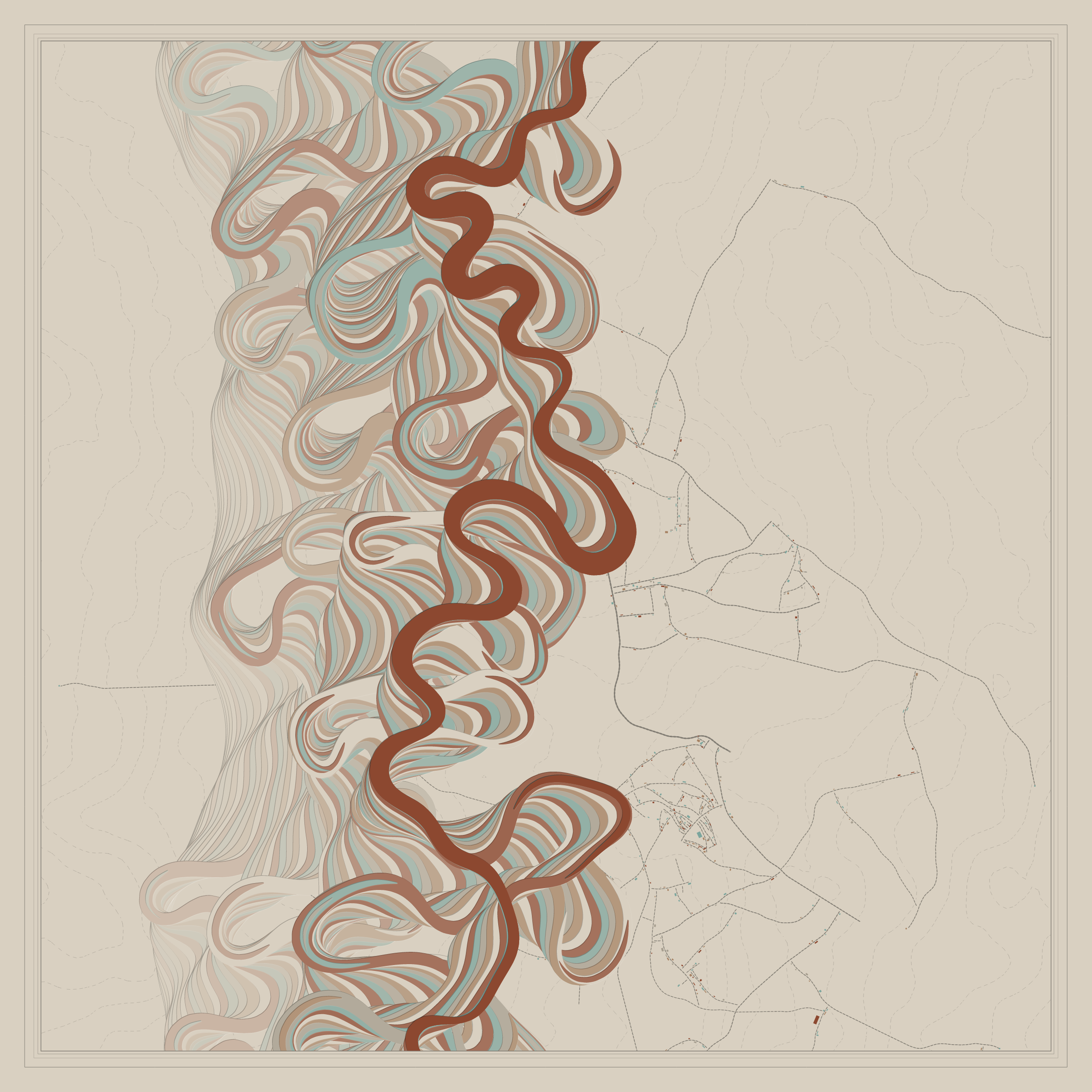 Ancient Courses is a generative experience that explores the aesthetics of meandering rivers and the settlements that form on their banks. The design is graphic and cartographic with bold color palettes rendered against map iconography and line sensibility. From the river banks, roads stretch across the landscape: sometimes a single access road, other times sprawling towns. The river meandering is simulated via a custom algorithm which closely models the real world process.