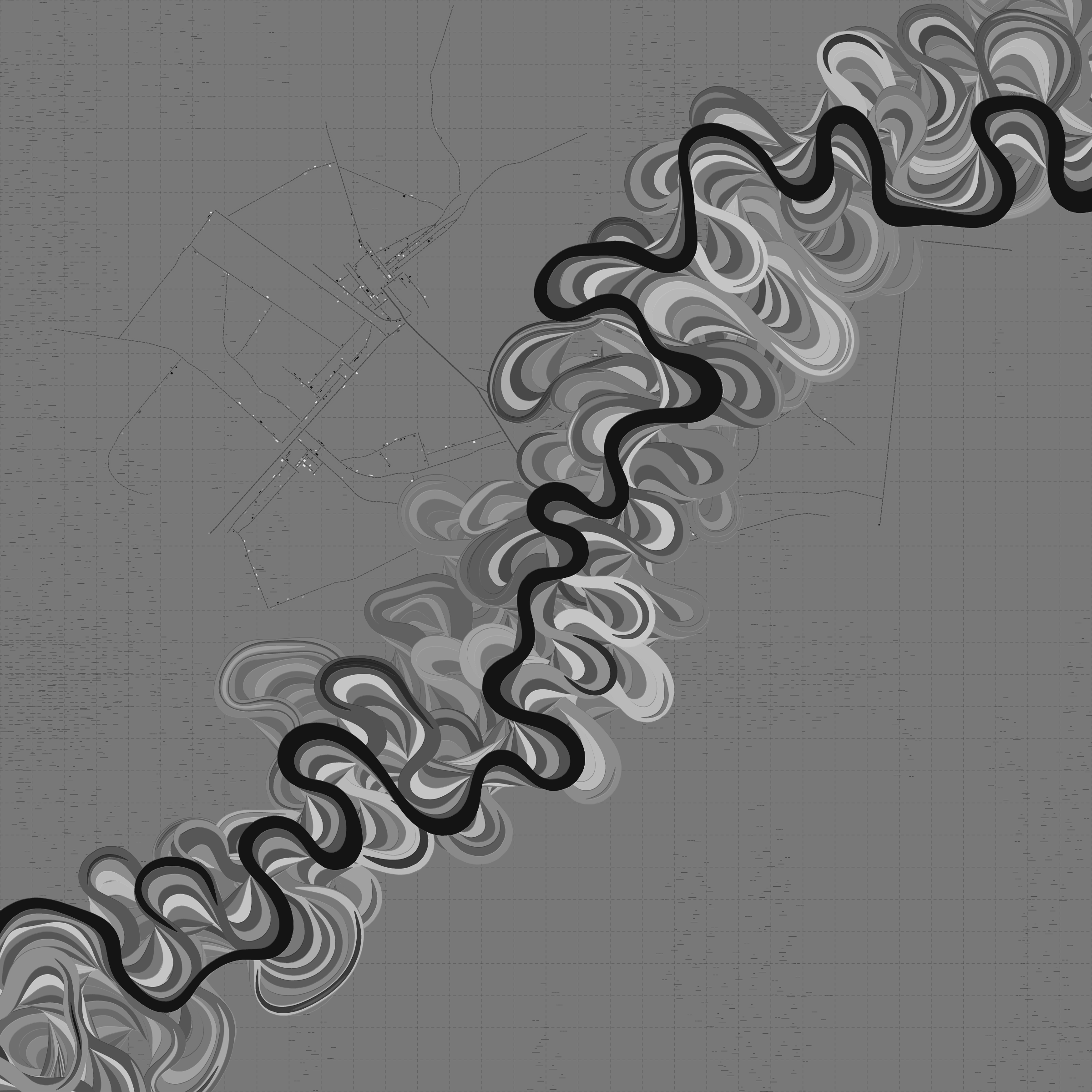 Ancient Courses is a generative experience that explores the aesthetics of meandering rivers and the settlements that form on their banks. The design is graphic and cartographic with bold color palettes rendered against map iconography and line sensibility. From the river banks, roads stretch across the landscape: sometimes a single access road, other times sprawling towns. The river meandering is simulated via a custom algorithm which closely models the real world process.