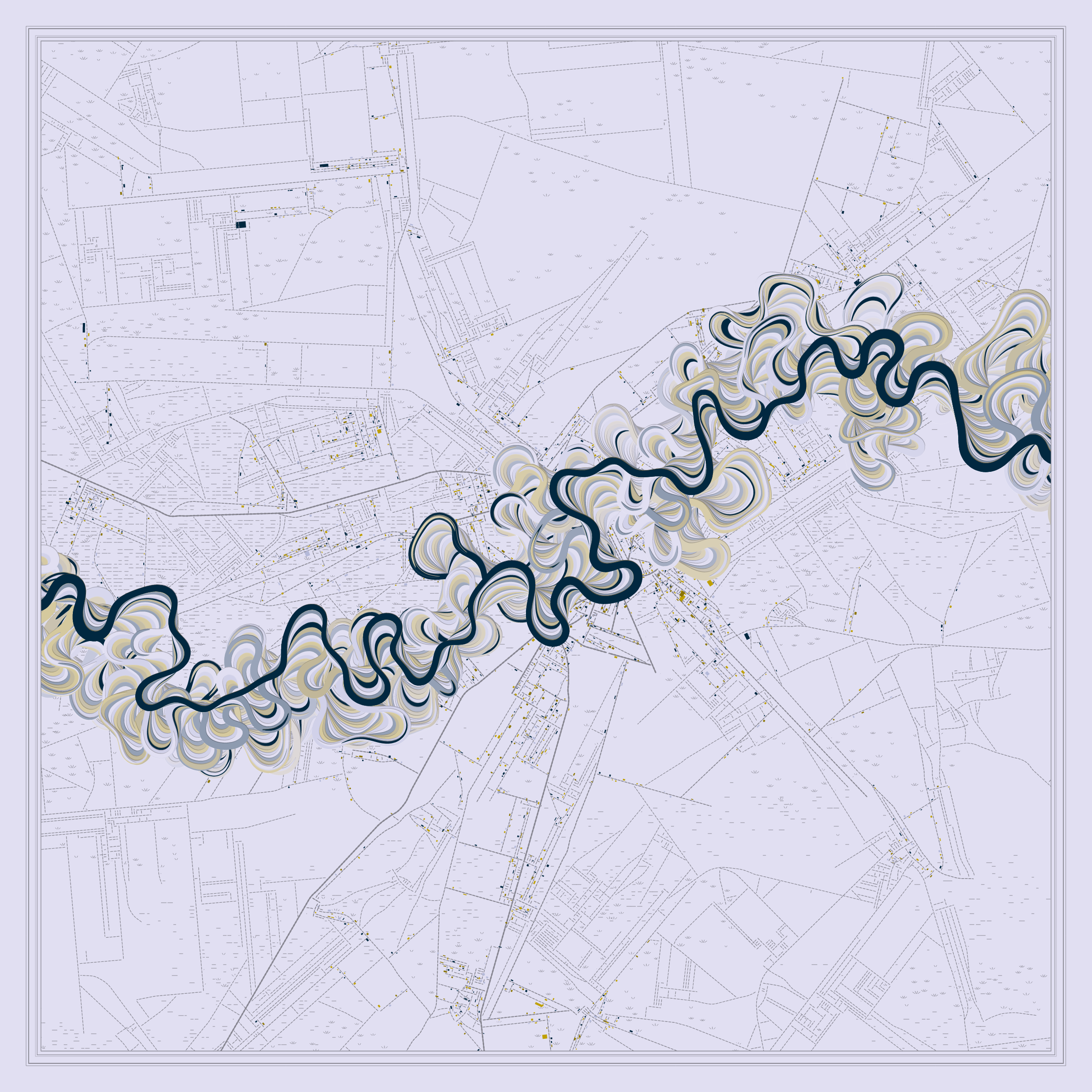Ancient Courses is a generative experience that explores the aesthetics of meandering rivers and the settlements that form on their banks. The design is graphic and cartographic with bold color palettes rendered against map iconography and line sensibility. From the river banks, roads stretch across the landscape: sometimes a single access road, other times sprawling towns. The river meandering is simulated via a custom algorithm which closely models the real world process.