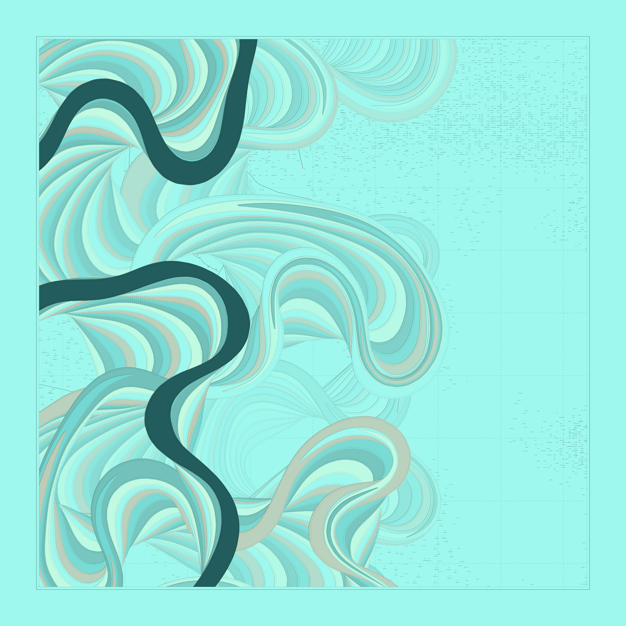 Ancient Courses is a generative experience that explores the aesthetics of meandering rivers and the settlements that form on their banks. The design is graphic and cartographic with bold color palettes rendered against map iconography and line sensibility. From the river banks, roads stretch across the landscape: sometimes a single access road, other times sprawling towns. The river meandering is simulated via a custom algorithm which closely models the real world process.