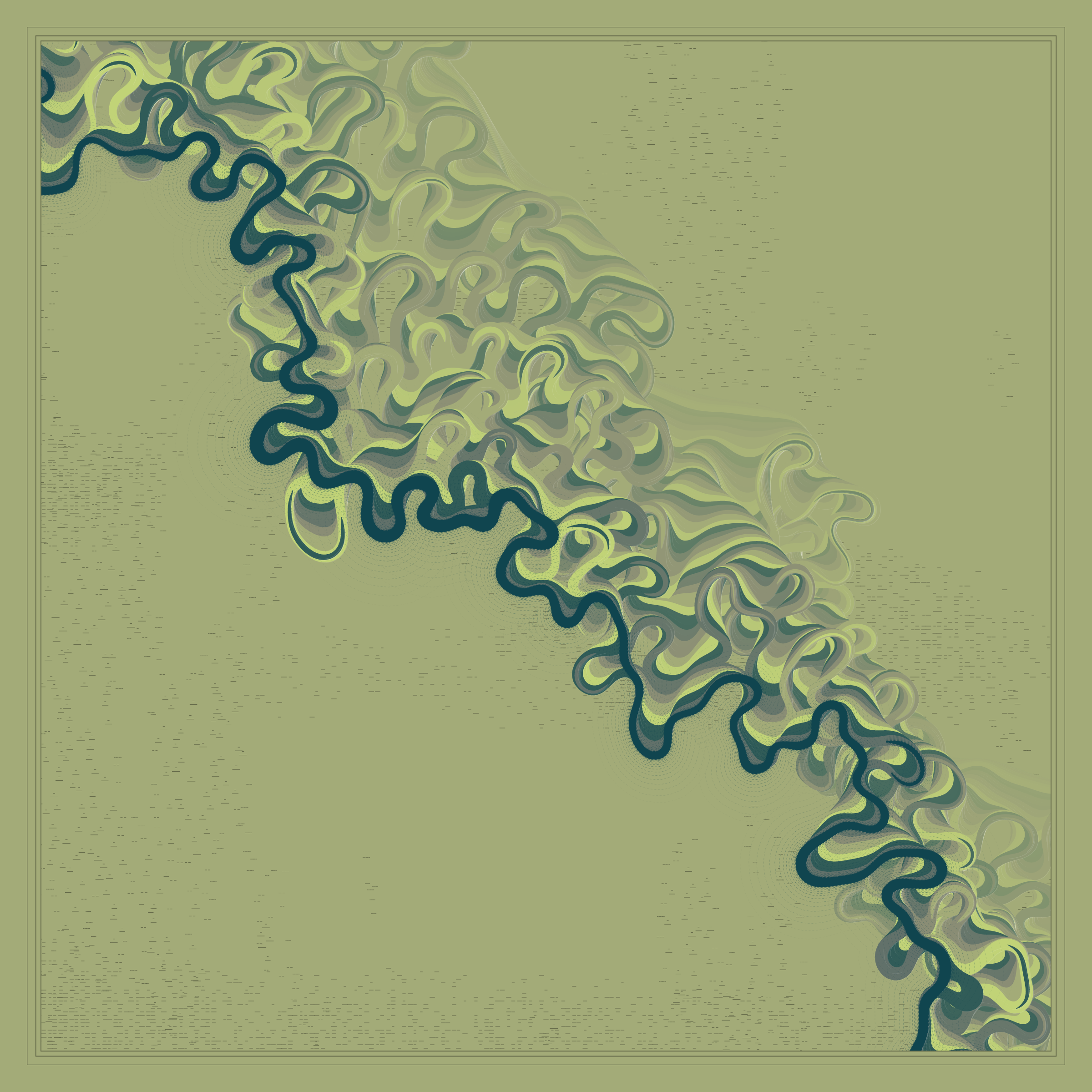 Ancient Courses is a generative experience that explores the aesthetics of meandering rivers and the settlements that form on their banks. The design is graphic and cartographic with bold color palettes rendered against map iconography and line sensibility. From the river banks, roads stretch across the landscape: sometimes a single access road, other times sprawling towns. The river meandering is simulated via a custom algorithm which closely models the real world process.