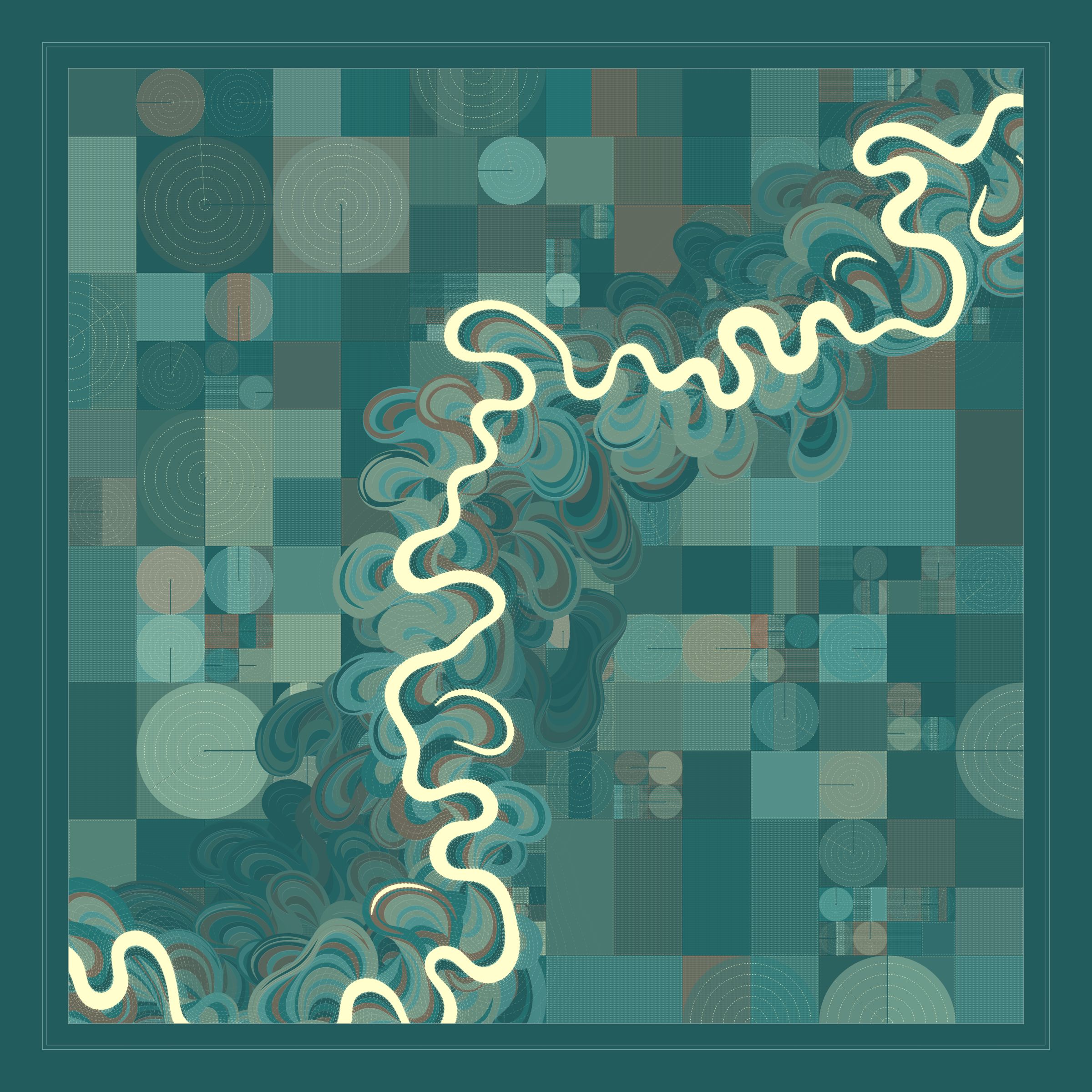 Ancient Courses is a generative experience that explores the aesthetics of meandering rivers and the settlements that form on their banks. The design is graphic and cartographic with bold color palettes rendered against map iconography and line sensibility. From the river banks, roads stretch across the landscape: sometimes a single access road, other times sprawling towns. The river meandering is simulated via a custom algorithm which closely models the real world process.