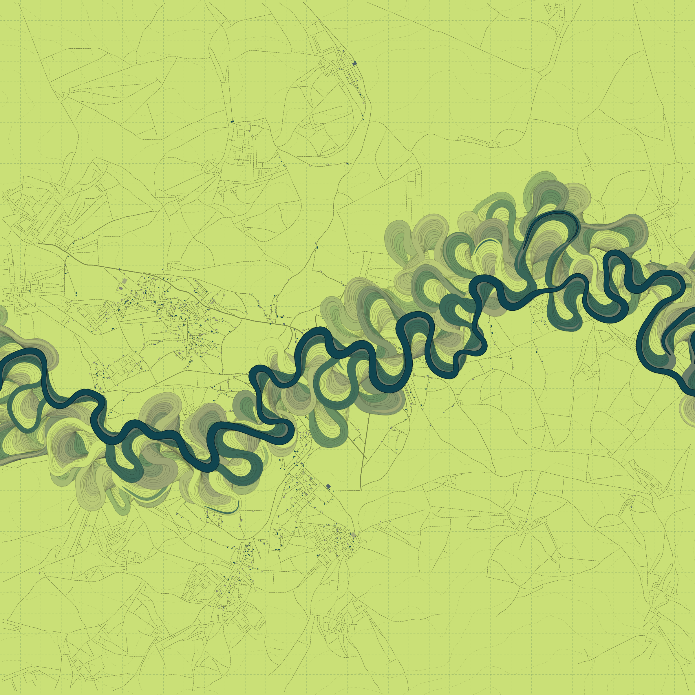 Ancient Courses is a generative experience that explores the aesthetics of meandering rivers and the settlements that form on their banks. The design is graphic and cartographic with bold color palettes rendered against map iconography and line sensibility. From the river banks, roads stretch across the landscape: sometimes a single access road, other times sprawling towns. The river meandering is simulated via a custom algorithm which closely models the real world process.