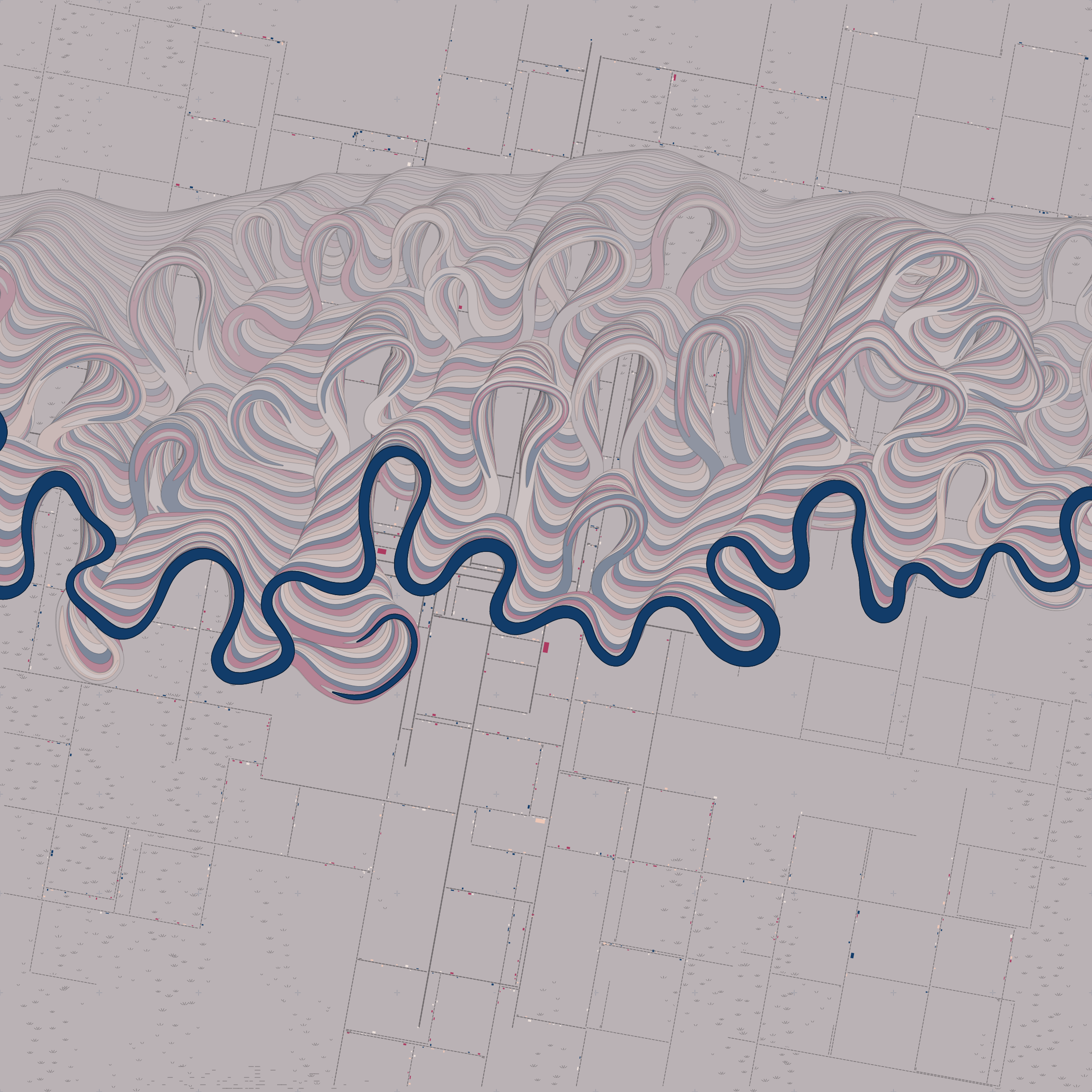 Ancient Courses is a generative experience that explores the aesthetics of meandering rivers and the settlements that form on their banks. The design is graphic and cartographic with bold color palettes rendered against map iconography and line sensibility. From the river banks, roads stretch across the landscape: sometimes a single access road, other times sprawling towns. The river meandering is simulated via a custom algorithm which closely models the real world process.