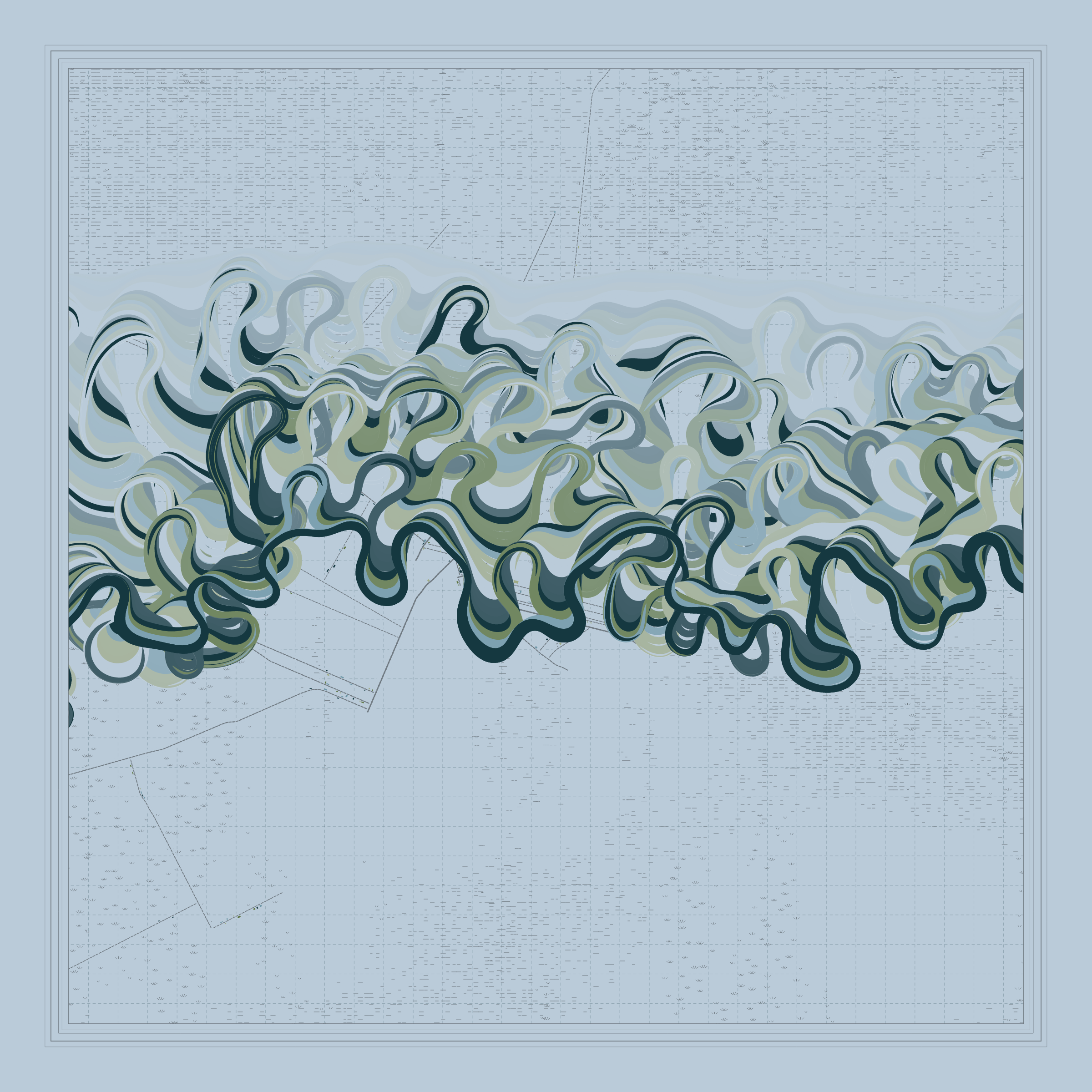 Ancient Courses is a generative experience that explores the aesthetics of meandering rivers and the settlements that form on their banks. The design is graphic and cartographic with bold color palettes rendered against map iconography and line sensibility. From the river banks, roads stretch across the landscape: sometimes a single access road, other times sprawling towns. The river meandering is simulated via a custom algorithm which closely models the real world process.