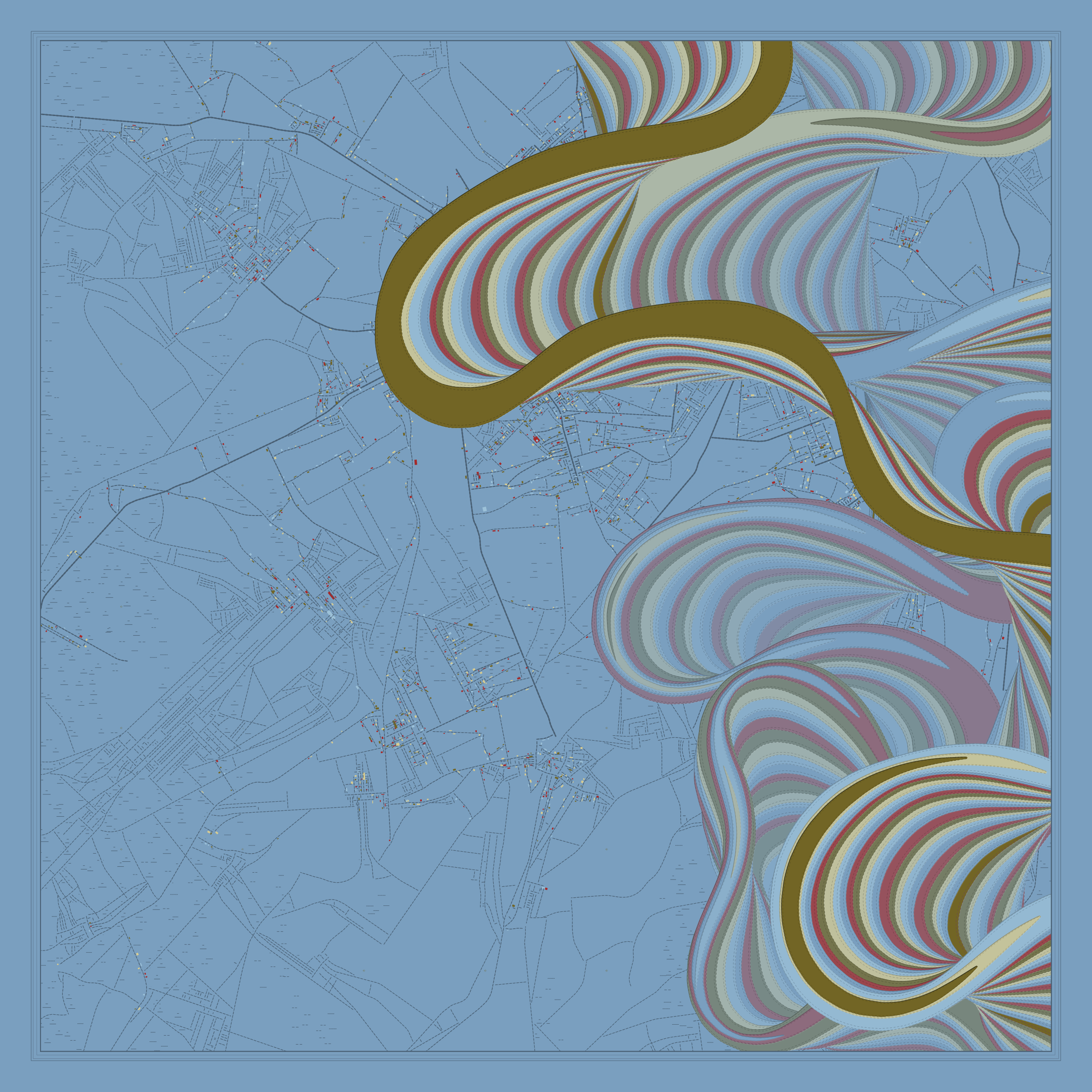Ancient Courses is a generative experience that explores the aesthetics of meandering rivers and the settlements that form on their banks. The design is graphic and cartographic with bold color palettes rendered against map iconography and line sensibility. From the river banks, roads stretch across the landscape: sometimes a single access road, other times sprawling towns. The river meandering is simulated via a custom algorithm which closely models the real world process.