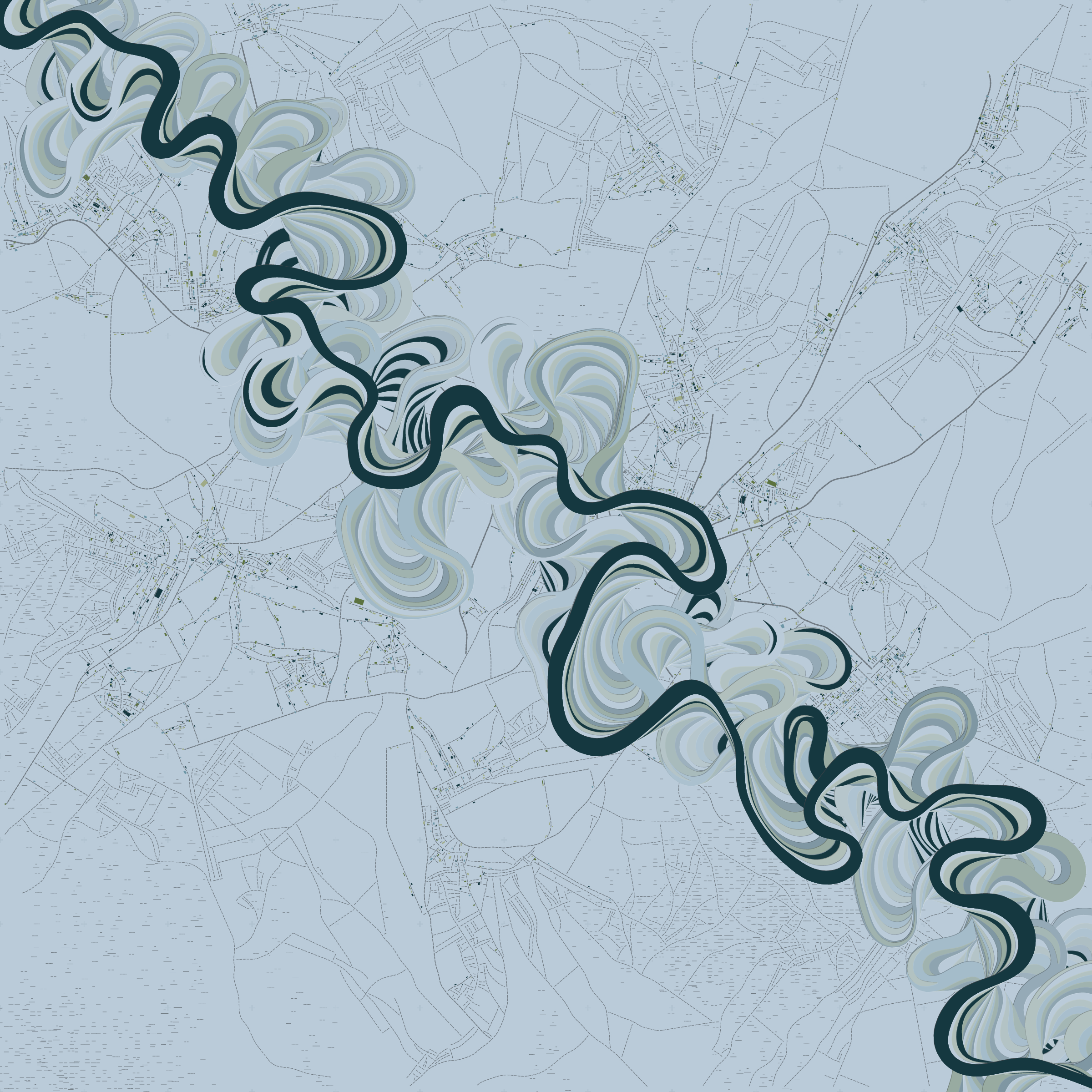 Ancient Courses is a generative experience that explores the aesthetics of meandering rivers and the settlements that form on their banks. The design is graphic and cartographic with bold color palettes rendered against map iconography and line sensibility. From the river banks, roads stretch across the landscape: sometimes a single access road, other times sprawling towns. The river meandering is simulated via a custom algorithm which closely models the real world process.