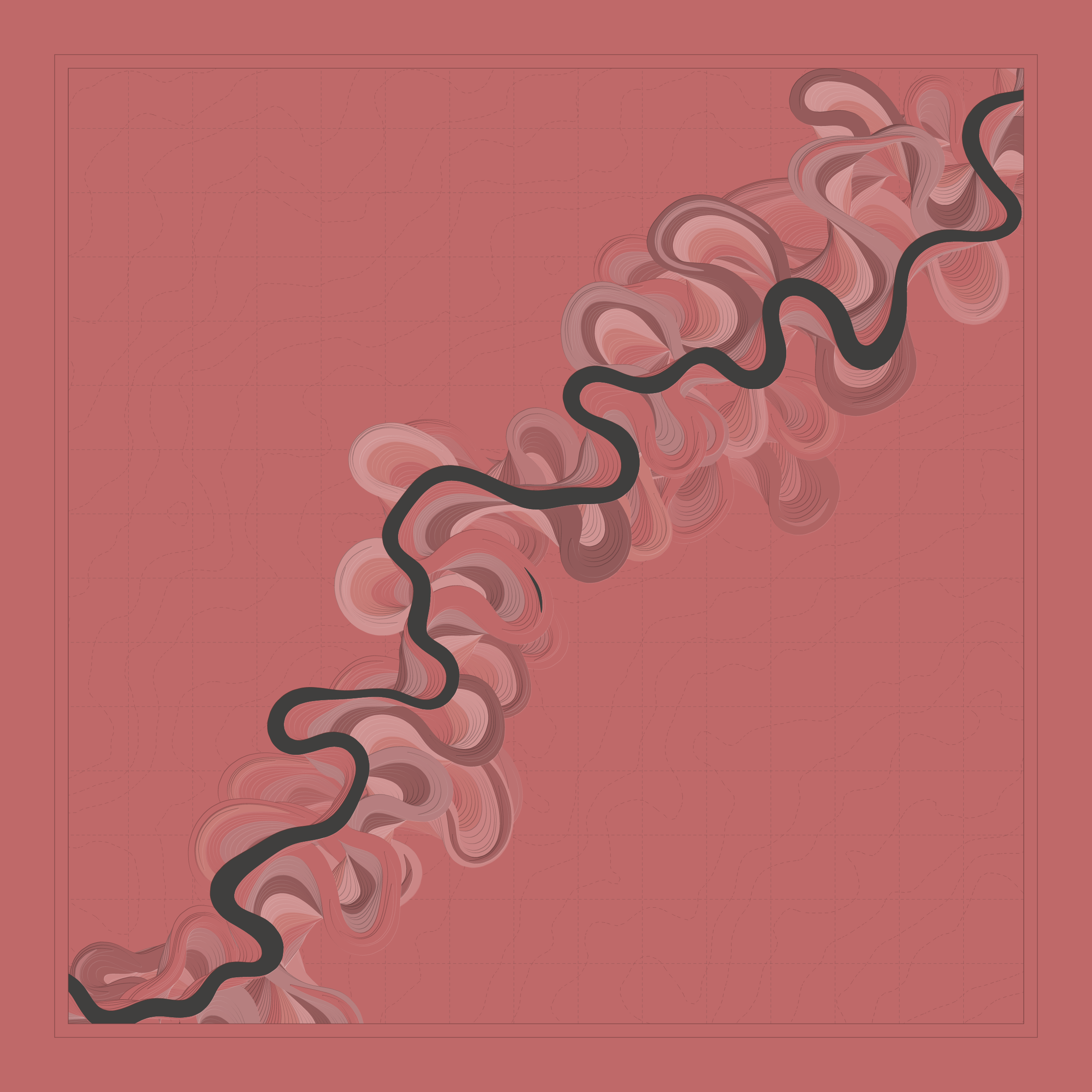 Ancient Courses is a generative experience that explores the aesthetics of meandering rivers and the settlements that form on their banks. The design is graphic and cartographic with bold color palettes rendered against map iconography and line sensibility. From the river banks, roads stretch across the landscape: sometimes a single access road, other times sprawling towns. The river meandering is simulated via a custom algorithm which closely models the real world process.