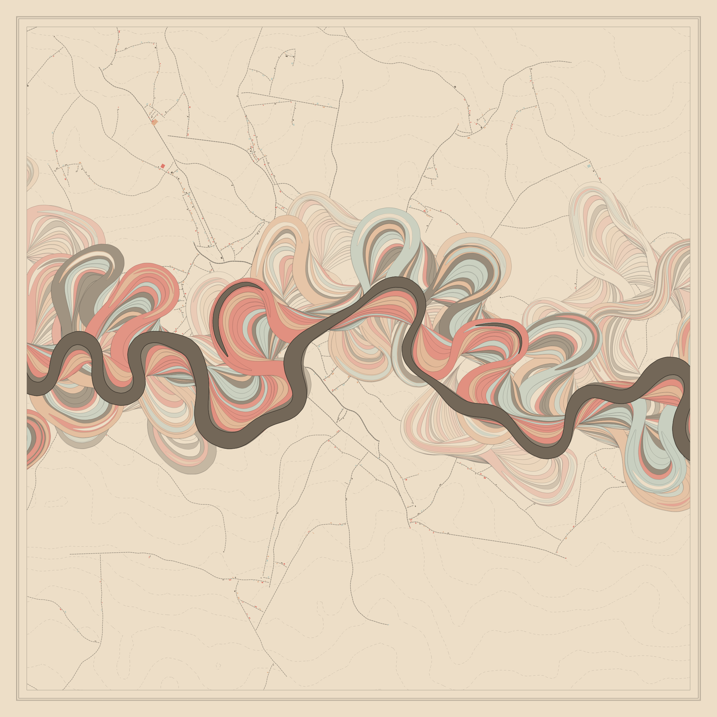 Ancient Courses is a generative experience that explores the aesthetics of meandering rivers and the settlements that form on their banks. The design is graphic and cartographic with bold color palettes rendered against map iconography and line sensibility. From the river banks, roads stretch across the landscape: sometimes a single access road, other times sprawling towns. The river meandering is simulated via a custom algorithm which closely models the real world process.