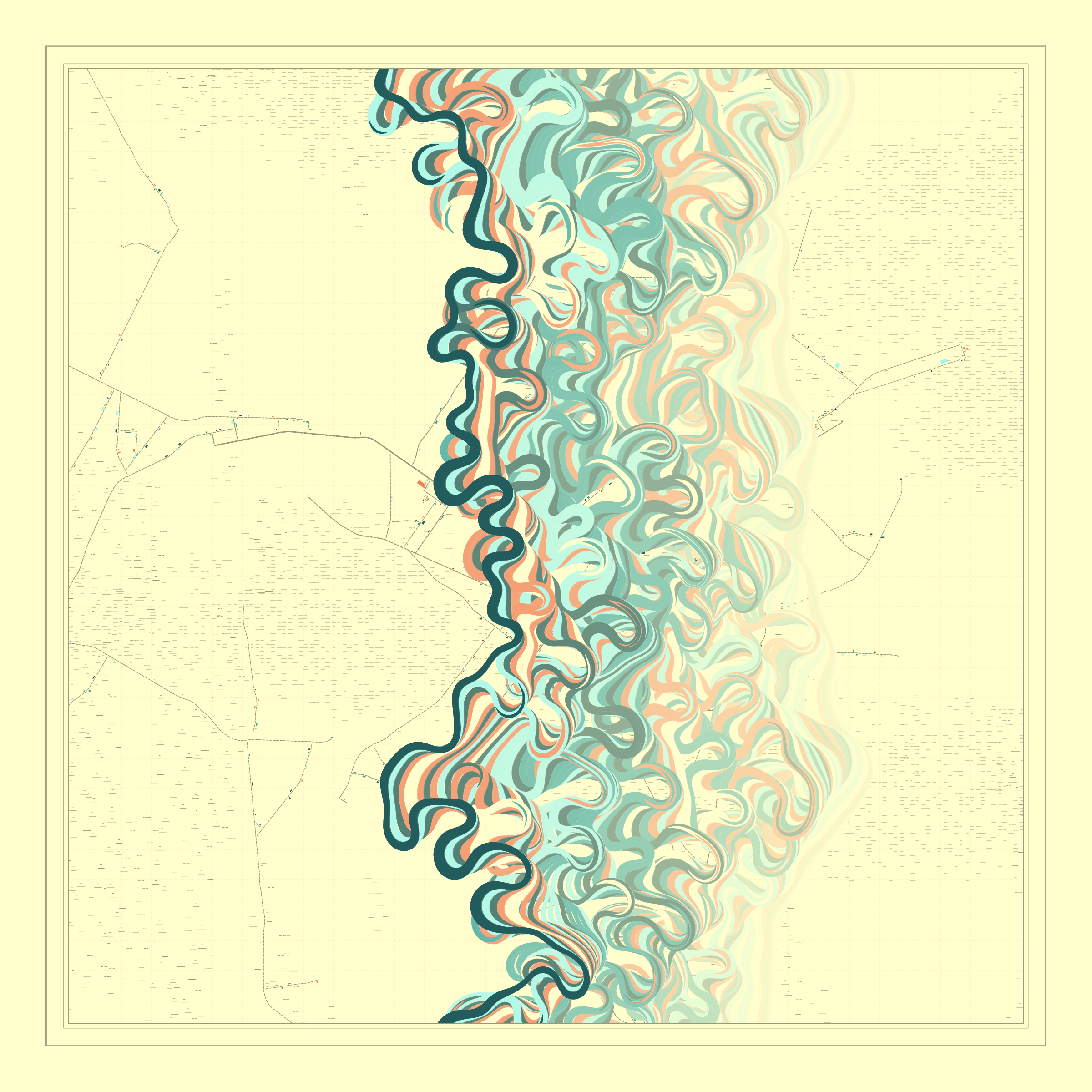 Ancient Courses is a generative experience that explores the aesthetics of meandering rivers and the settlements that form on their banks. The design is graphic and cartographic with bold color palettes rendered against map iconography and line sensibility. From the river banks, roads stretch across the landscape: sometimes a single access road, other times sprawling towns. The river meandering is simulated via a custom algorithm which closely models the real world process.