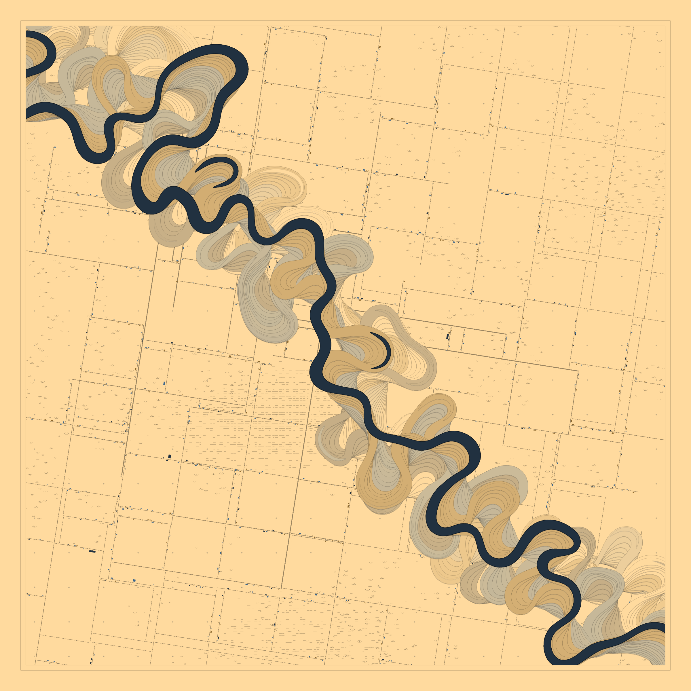 Ancient Courses is a generative experience that explores the aesthetics of meandering rivers and the settlements that form on their banks. The design is graphic and cartographic with bold color palettes rendered against map iconography and line sensibility. From the river banks, roads stretch across the landscape: sometimes a single access road, other times sprawling towns. The river meandering is simulated via a custom algorithm which closely models the real world process.