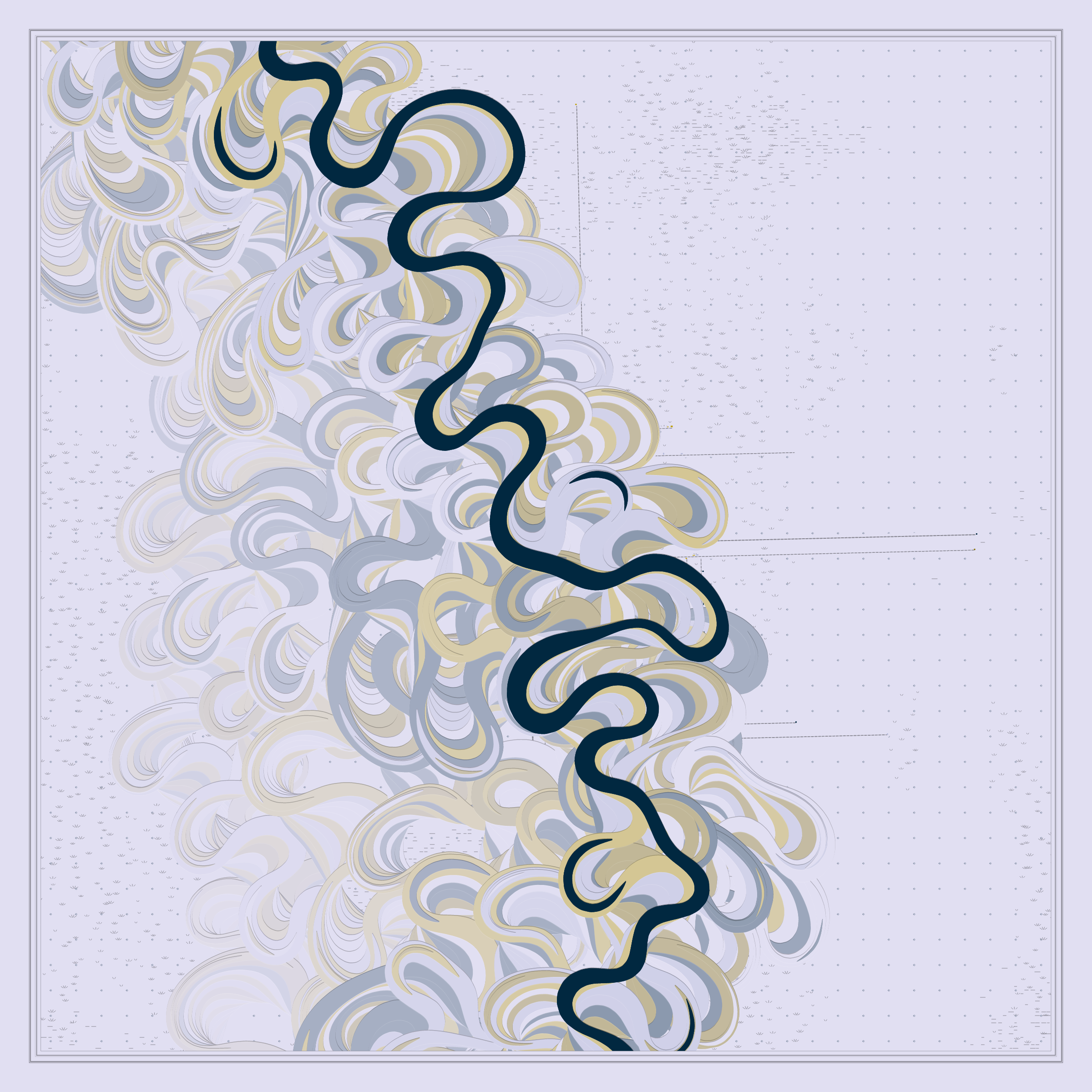 Ancient Courses is a generative experience that explores the aesthetics of meandering rivers and the settlements that form on their banks. The design is graphic and cartographic with bold color palettes rendered against map iconography and line sensibility. From the river banks, roads stretch across the landscape: sometimes a single access road, other times sprawling towns. The river meandering is simulated via a custom algorithm which closely models the real world process.
