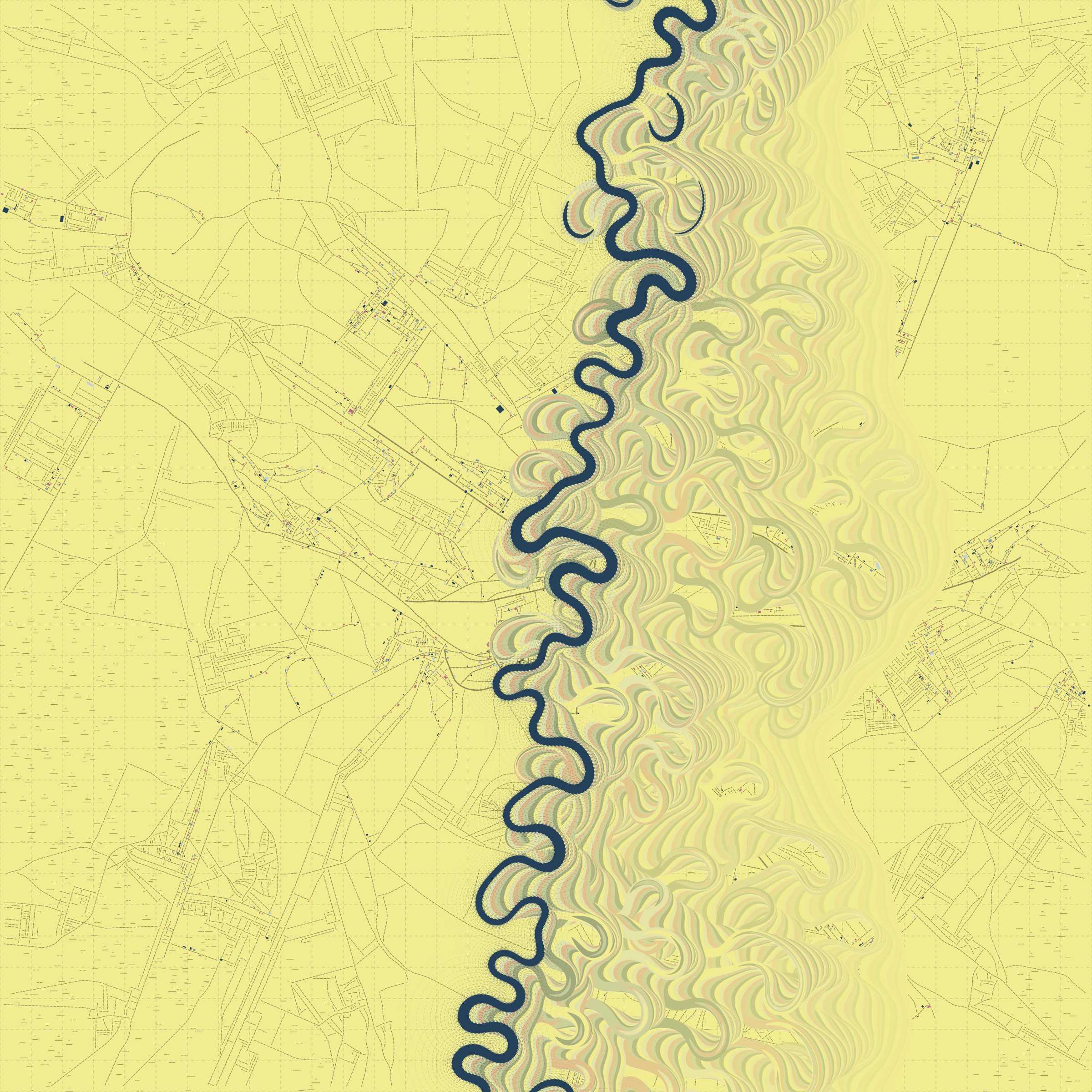 Ancient Courses is a generative experience that explores the aesthetics of meandering rivers and the settlements that form on their banks. The design is graphic and cartographic with bold color palettes rendered against map iconography and line sensibility. From the river banks, roads stretch across the landscape: sometimes a single access road, other times sprawling towns. The river meandering is simulated via a custom algorithm which closely models the real world process.